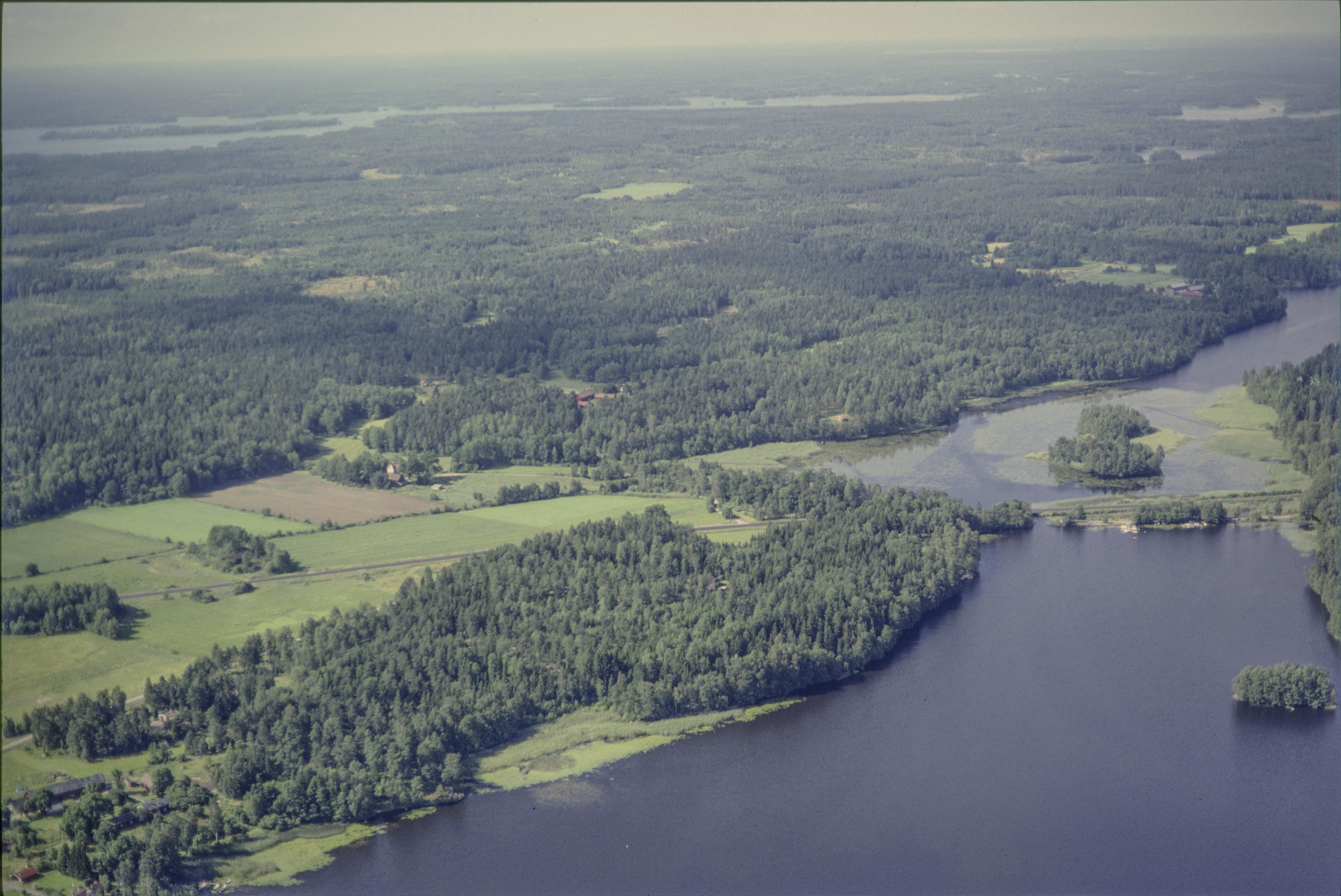 Beskrivning: Bronsåldersmiljö i Vagnåla från Unungehöjden. Sjön Närdingen mellan socknen Söderby-Karl (uppe till vänster) och Edsbro (uppe till höger). Tomasbol, Österbol och gravfält RAÄnr Ununge 189:1 m.fl. vid bildens mitt. Bilden är tagen mot (väderstreck): SV
