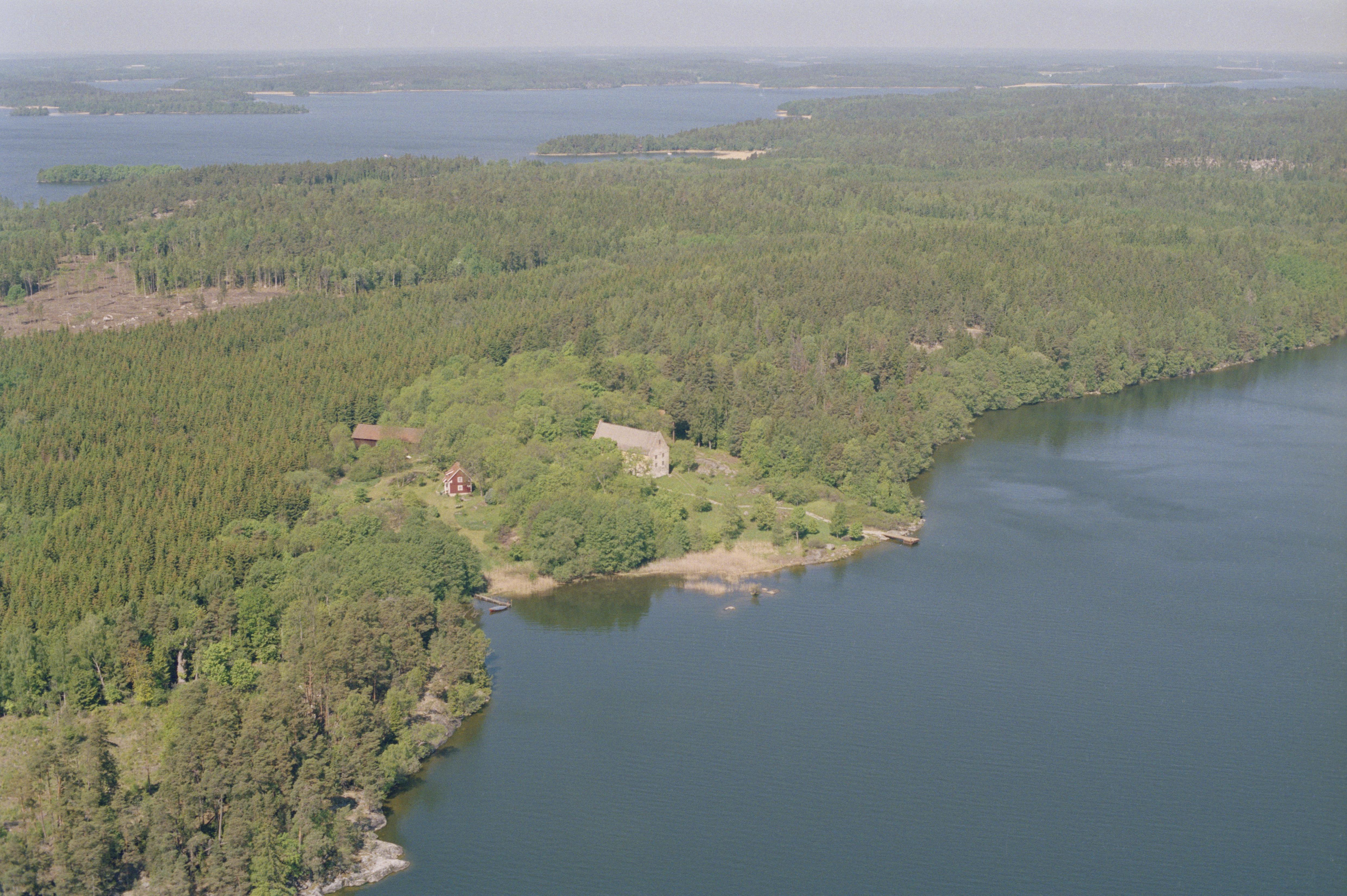 Beskrivning: Statligt byggnadsminne Utö hus RAÄnr Kungs-Husby 70:1 på Arnö vid Grönsösundet i Mälaren. Vid borgen magasin Kungs-Husby 75:1, gravfält Kungs-Husby 68:1 m.fl. Bilden är tagen mot (väderstreck): NV