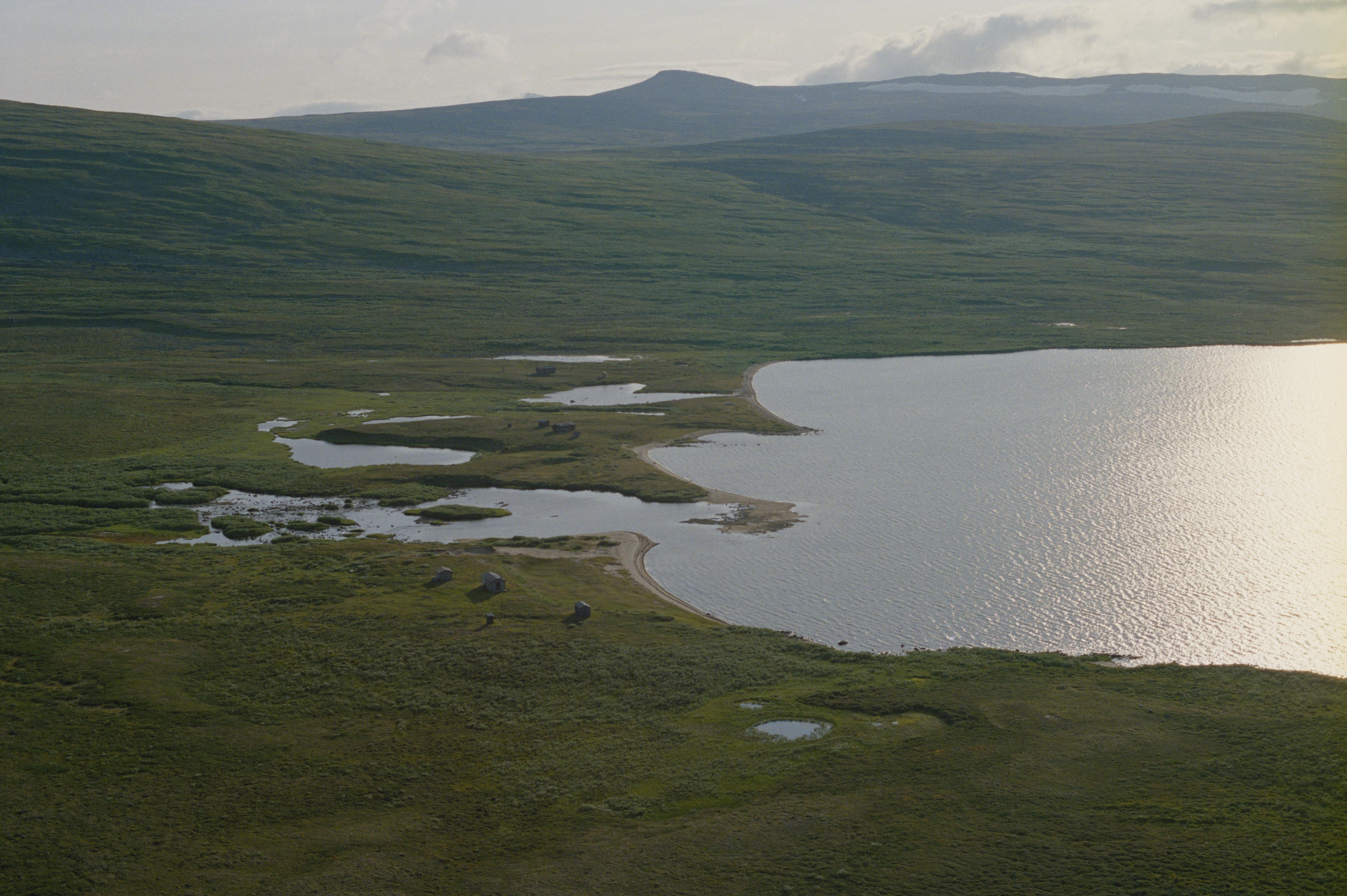 Beskrivning: Sjön Råstojaure (Rostojávri / Rostojärvi). Till vänster om bildens mitt stugor / viste vid näset Sorrinjarga (Sorrinjárga) på södra stranden. Vid näset boplats RAÄnr Karesuando 911, 915, härd Karesuando 913, 916, m.m. Bilden är tagen mot (väderstreck): VSV