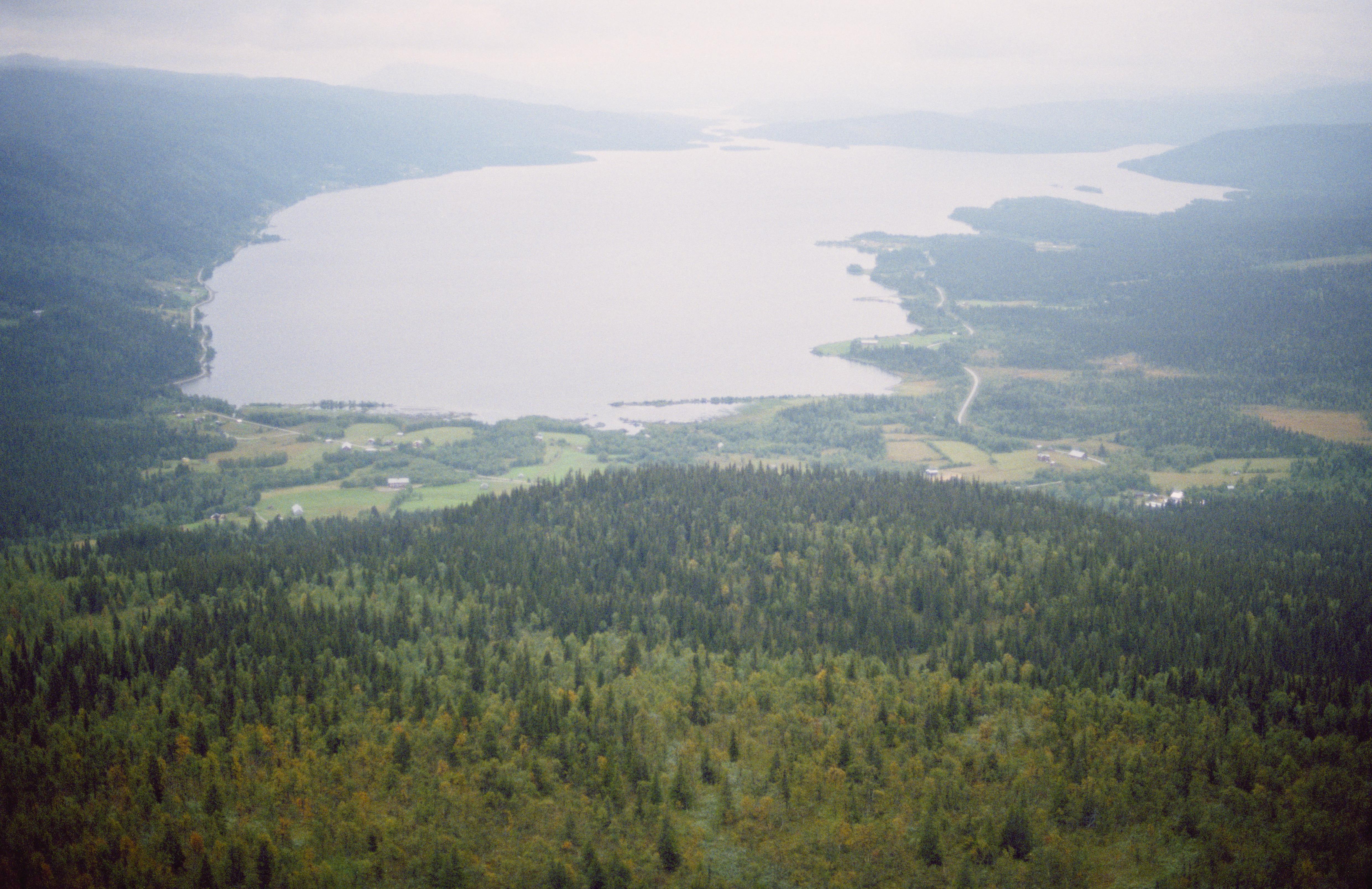 Beskrivning: Stor-Björkvattnet (Bearhkoejaevrie) i Björkvattensdalen från norra stranden mot sydost. Under bildens mitt Tärnamo by. I byn husgrund RAÄnr Tärna 985:1 och fyndplats Tärna 297:1. Byn Sörsandnäset och Gejmåns utlopp uppe till höger. Bilden är tagen mot (väderstreck): SO