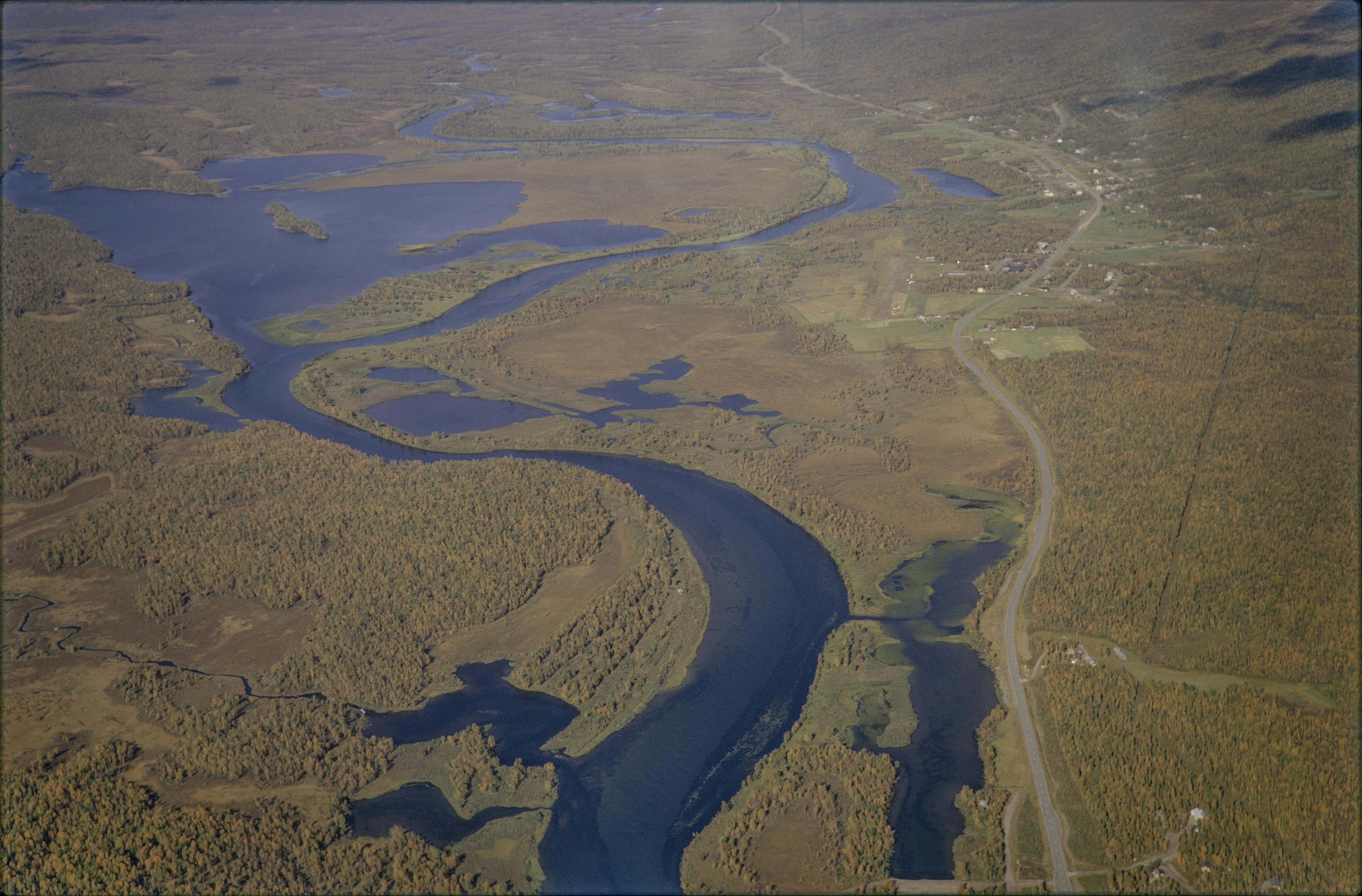 Beskrivning: Till höger över bildens mitt Hemavans flygplats / flygfält vid Umeälvens delta, söder om tätorten Hemavan (Bïerke) i Umeälvens dalgång. I tätorten i bildens övre del fornlämningsplats RAÄnr Tärna 1142 m.fl. Bilden är tagen mot (väderstreck): NNV
