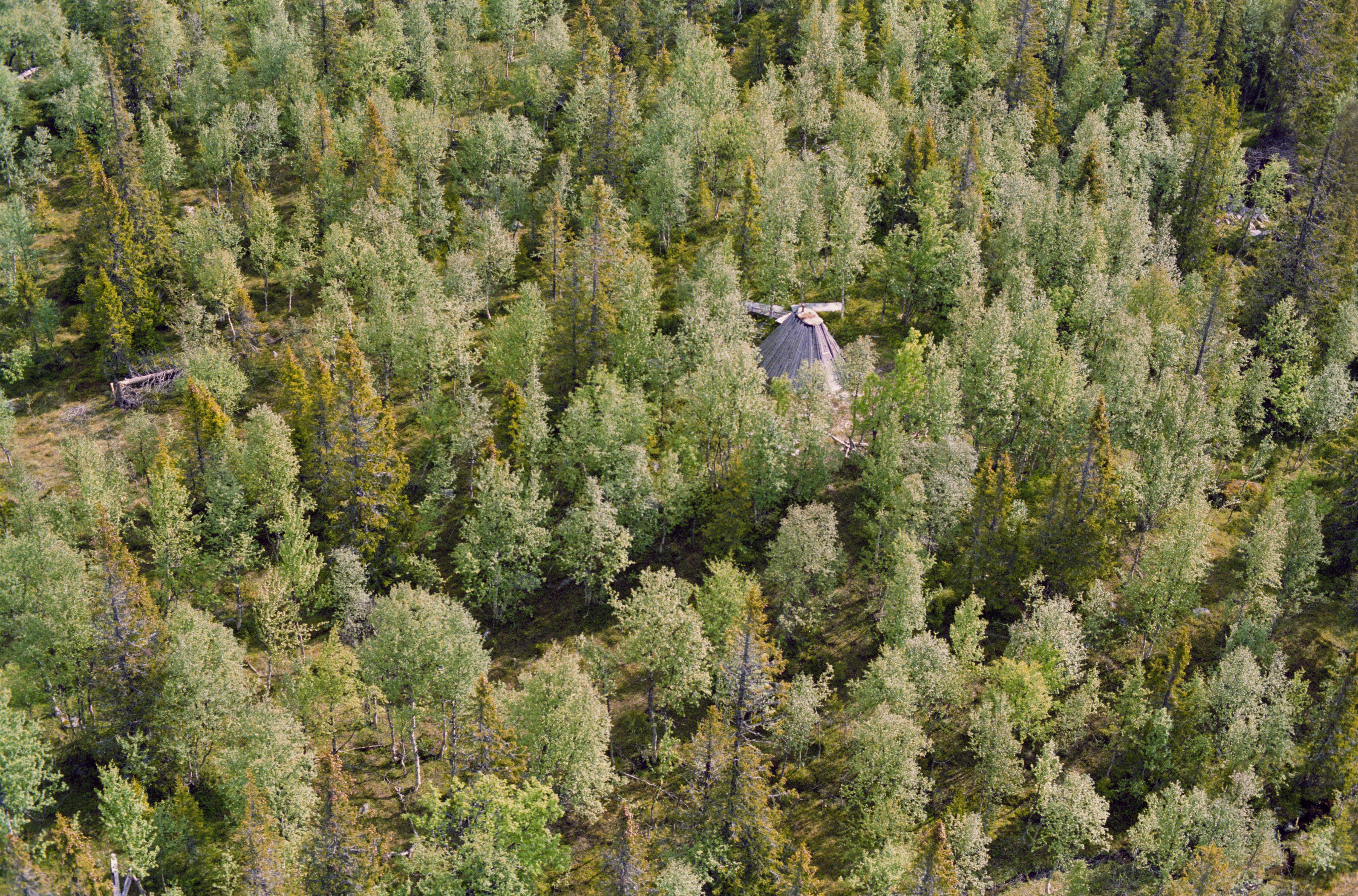 Beskrivning: Tomasvallen, ett f.d. sameviste med kåta (till höger om bildens mitt) i skogen på västsidan av sjön Bijelite (Bielite / Bijjie Lijhtie). Vistet med fossil åker RAÄnr Vilhelmina 1056:1-5 och 1219:1 ingår i Njakafjälls naturreservat. Bilden är tagen mot (väderstreck): NO