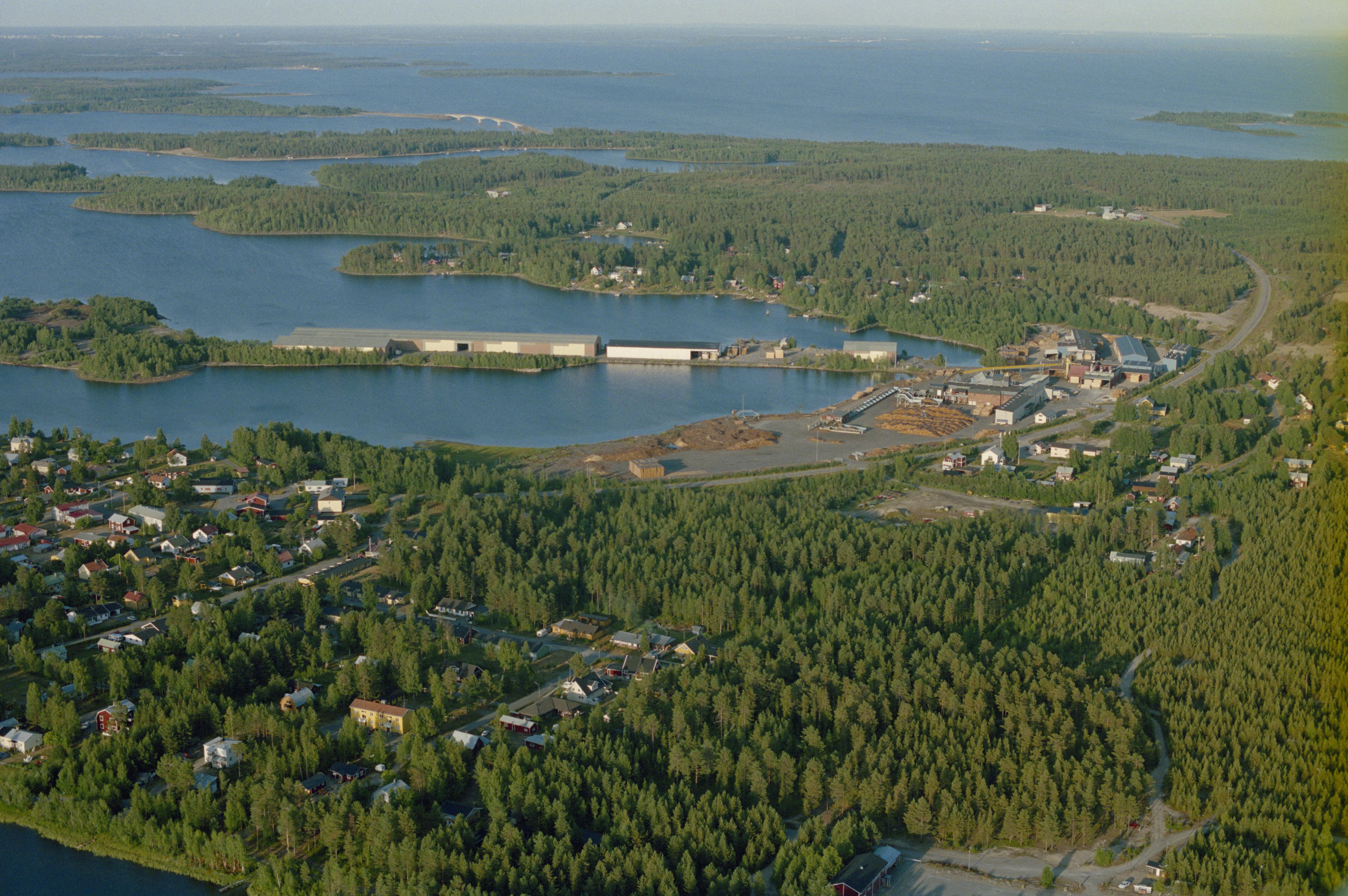 Beskrivning: Seskarö tätort, kyrkby och sågbrukssamhälle i norra delen av ön Seskarö (Seittenkaari) i Haparanda skärgård. Uppe till höger hamnen RAÄnr Nedertorneå 143:1 vid långa udden Lannaska. Bilden är tagen mot (väderstreck): ONO