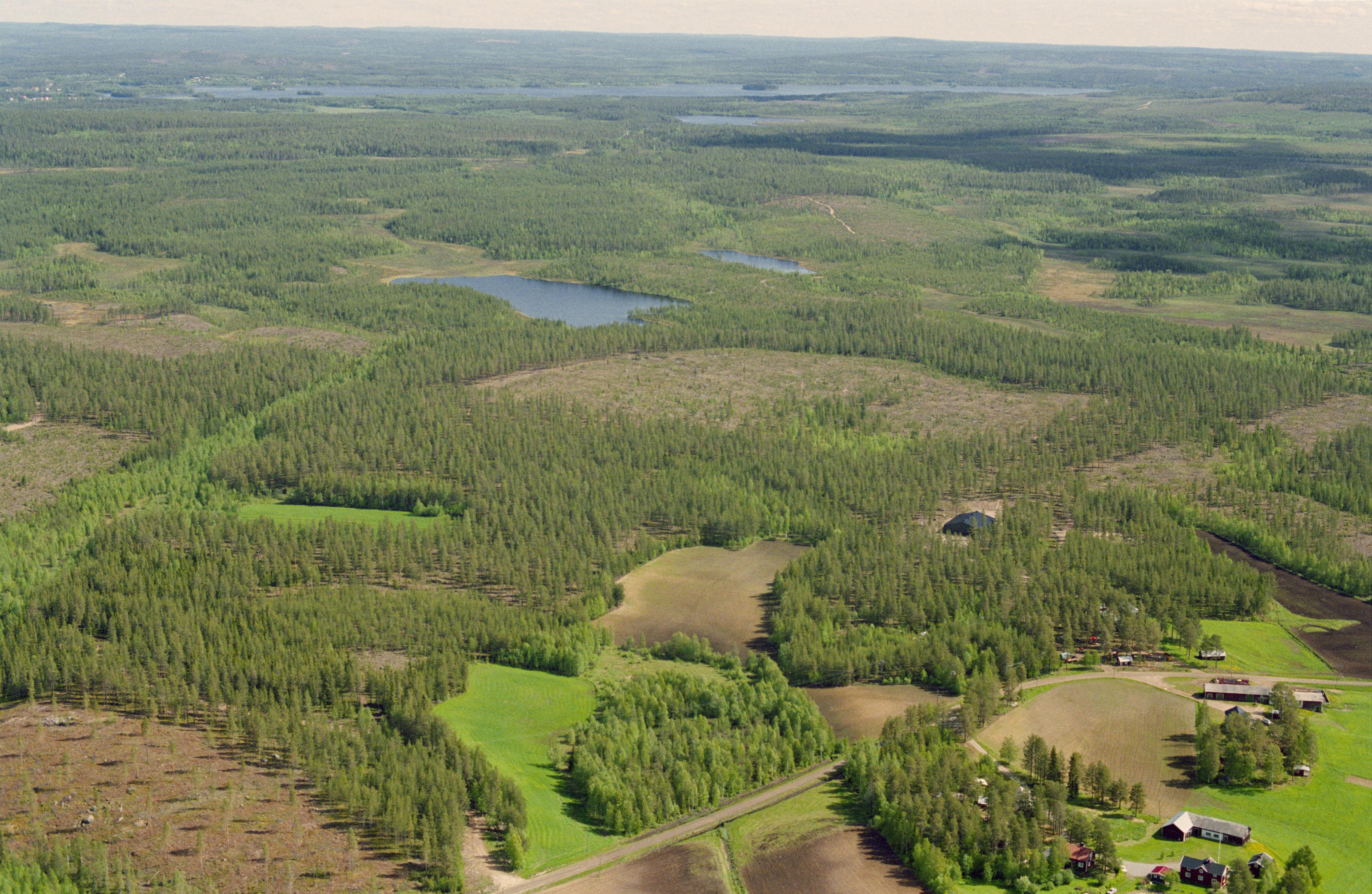 Beskrivning: Norra delen av byn Långsel vid Töreälven. Vid bildens mitt boplatsgrop RAÄnr Töre 391:1, 408:1, 411:1. m.m. i området vid Stortjärnheden, Stortjärnen och Mossarottjärnen. Till höger om bildens mitt Fattenborgs naturreservat. Bilden är tagen mot (väderstreck): NO