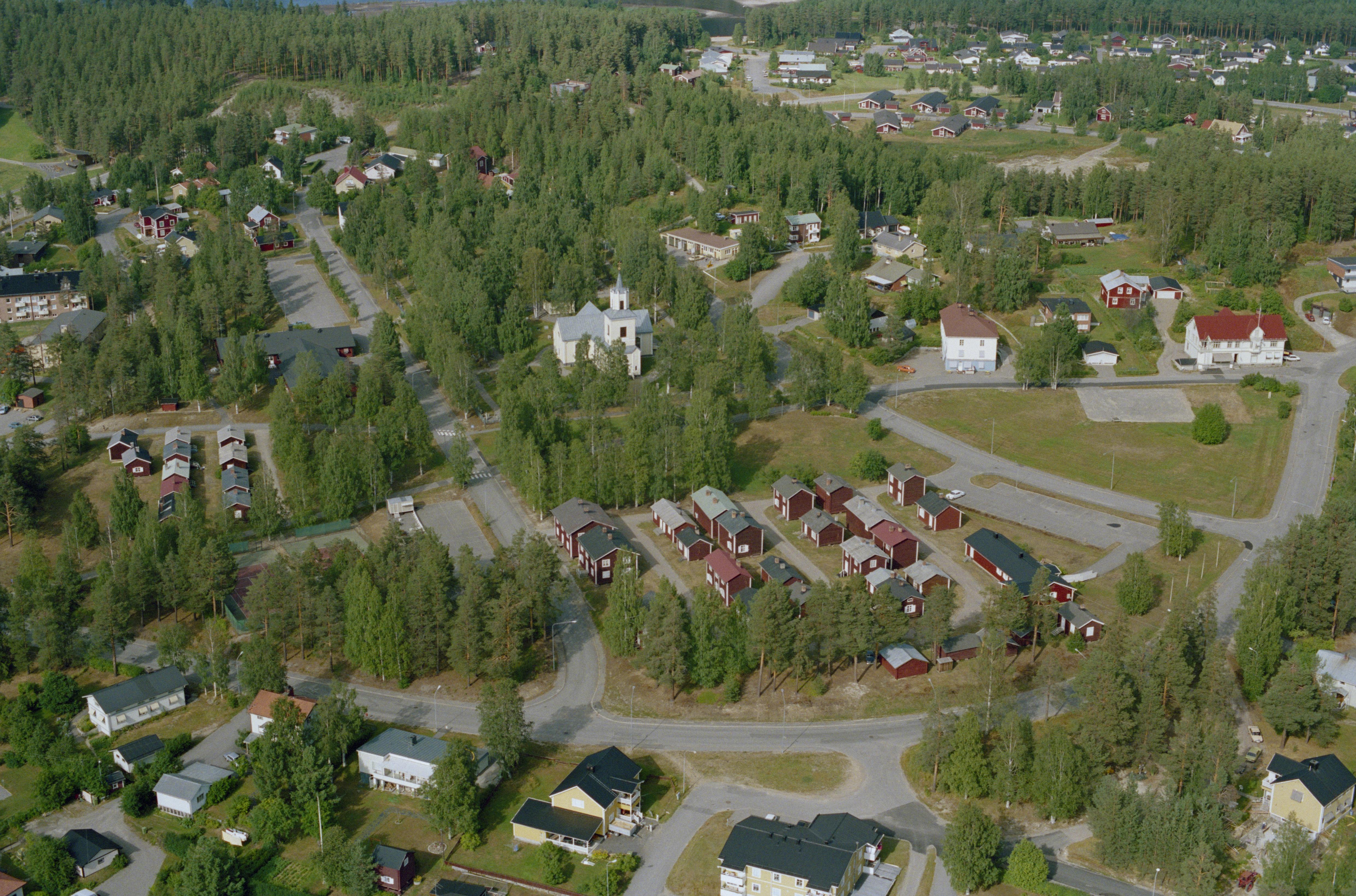 Beskrivning: Älvsbyn tätort och kyrkby vid Piteälven. Älvsby kyrka i bildens mitt. Vid kyrkan minnesmärke RAÄnr Älvsby 31:1. Bilden är tagen mot (väderstreck): NNO