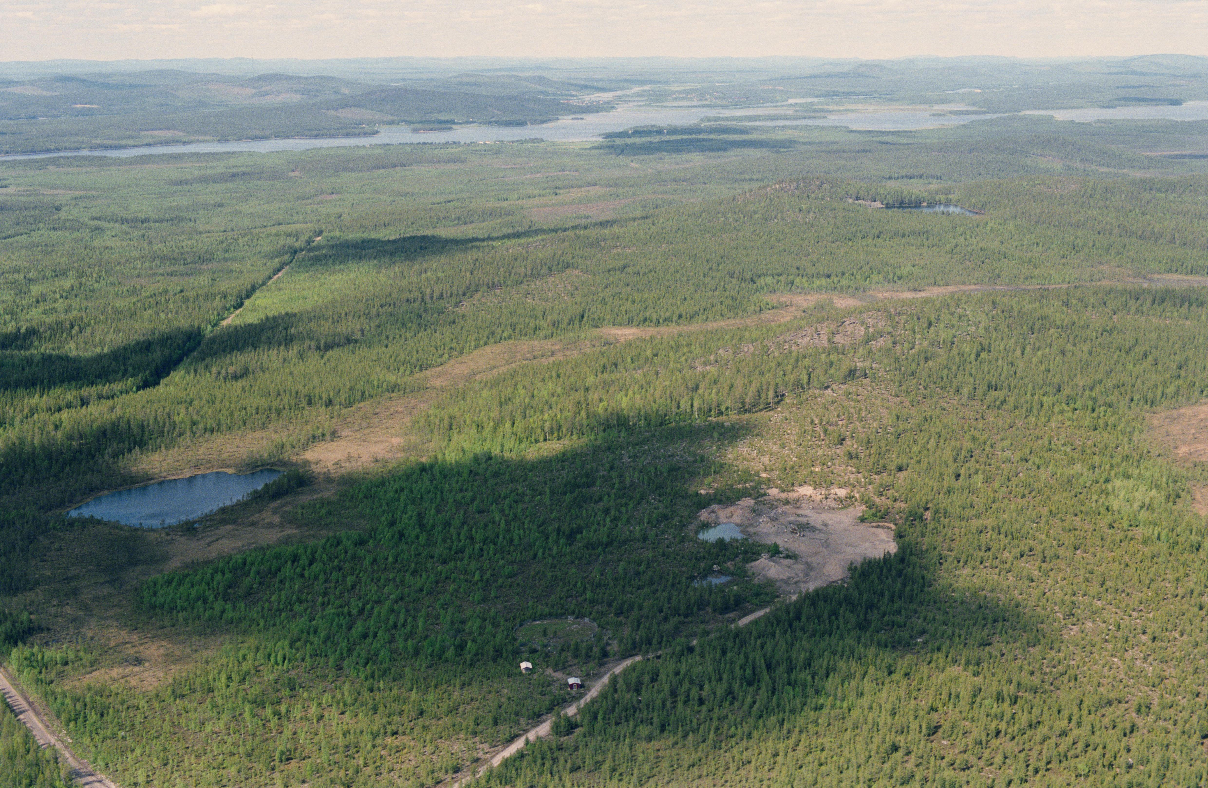 Beskrivning: Området Slättåsen vid Slättåsberget. Under bildens mitt sameviste med rengärden. Slättåstjärnen till vänster. Boplatsgrop RAÄnr Överkalix 533:1 vid skogsvägen uppe till vänster. Sjön Djupträsket och Kalixälven i bildens övre kant. Bilden är tagen mot (väderstreck): V