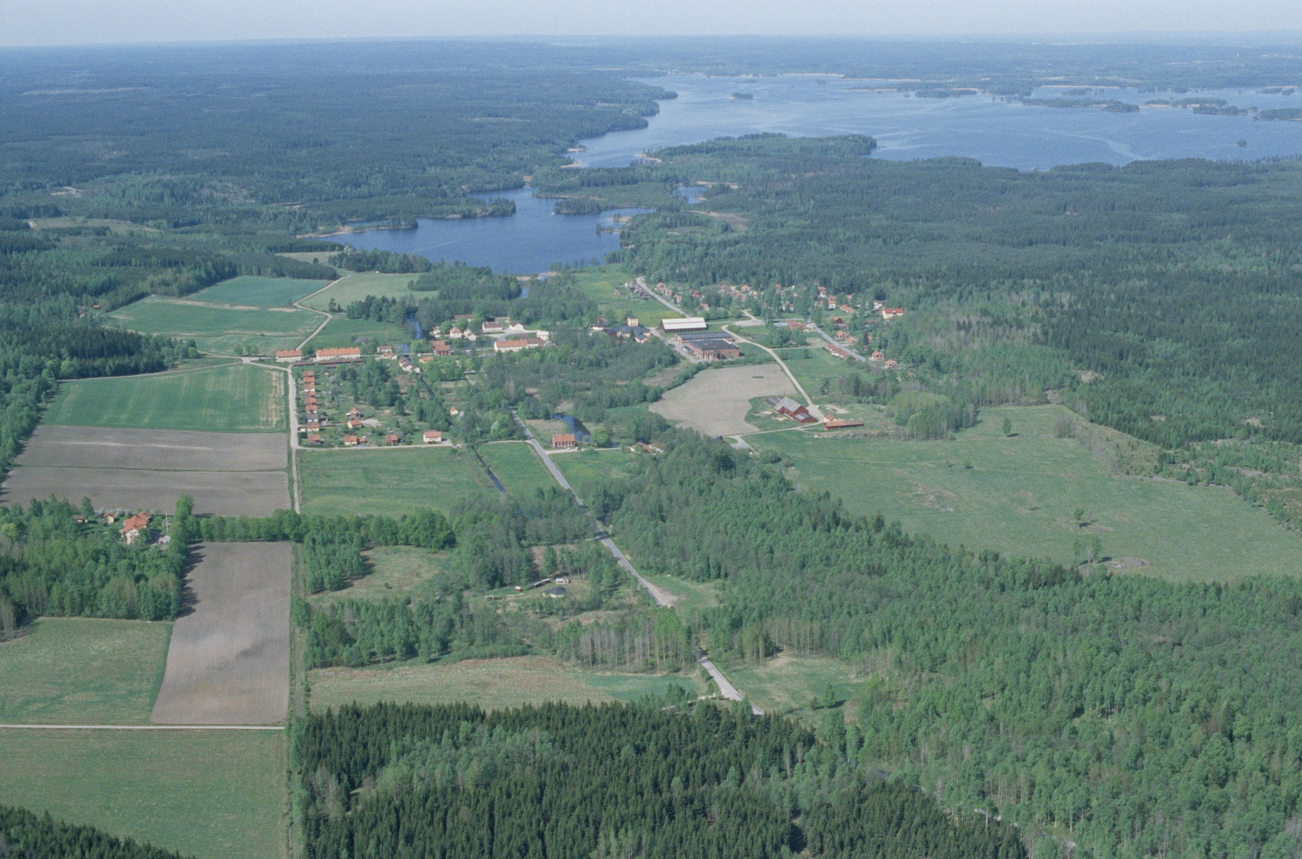 Beskrivning: Brevens bruk, hytt- och hammarområde RAÄnr Asker 258 vid Brevensån och sjöarna Botaren och Sottaren. Brevens kyrka vid bildens mitt. Bilden är tagen mot (väderstreck): VSV