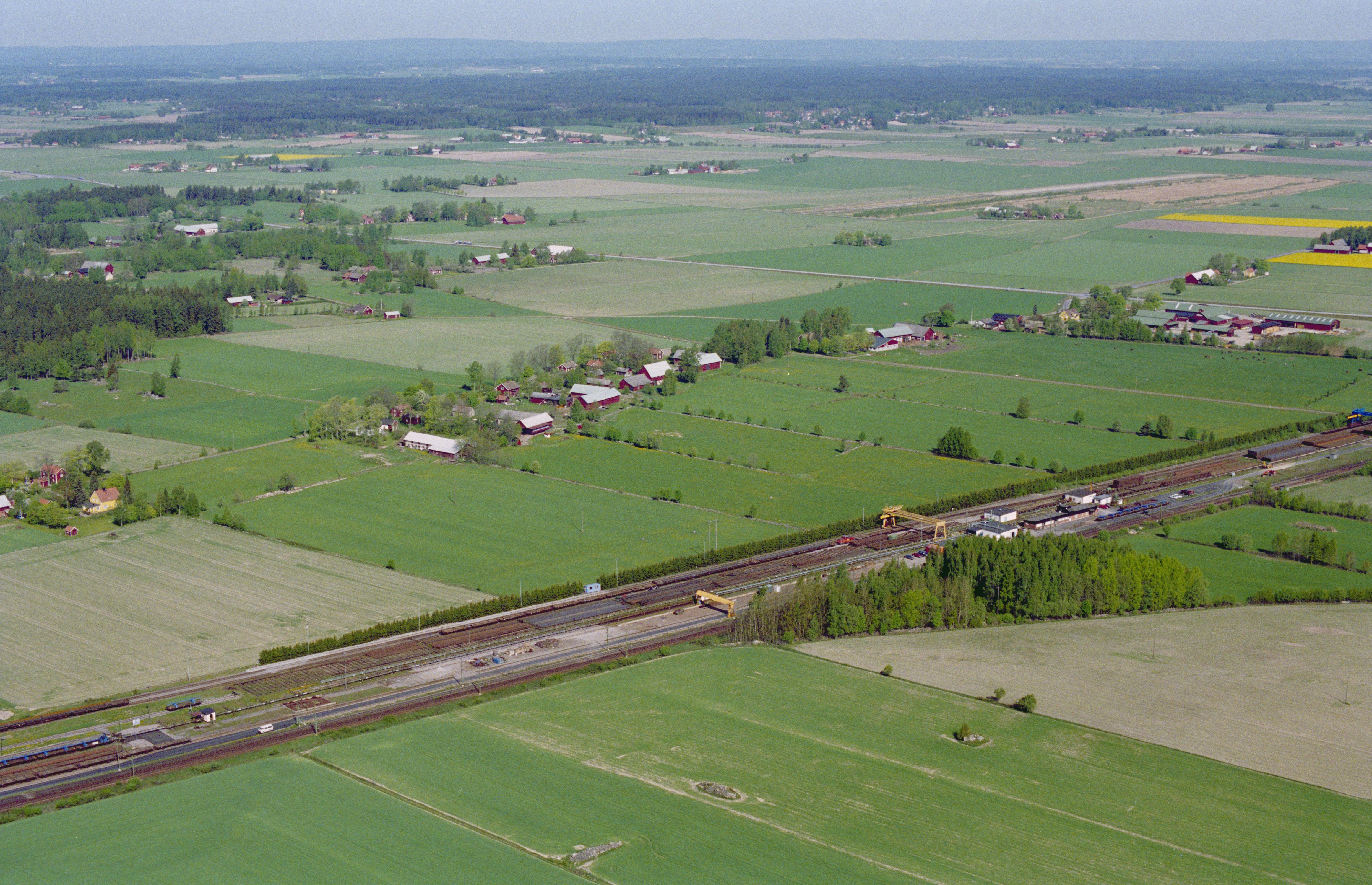 Beskrivning: Radbyn Rösavi vid bildens mitt med gravfält RAÄnr Kumla 40:1. I bildens övre till vänster Björka by. Bilden är tagen mot (väderstreck): NV