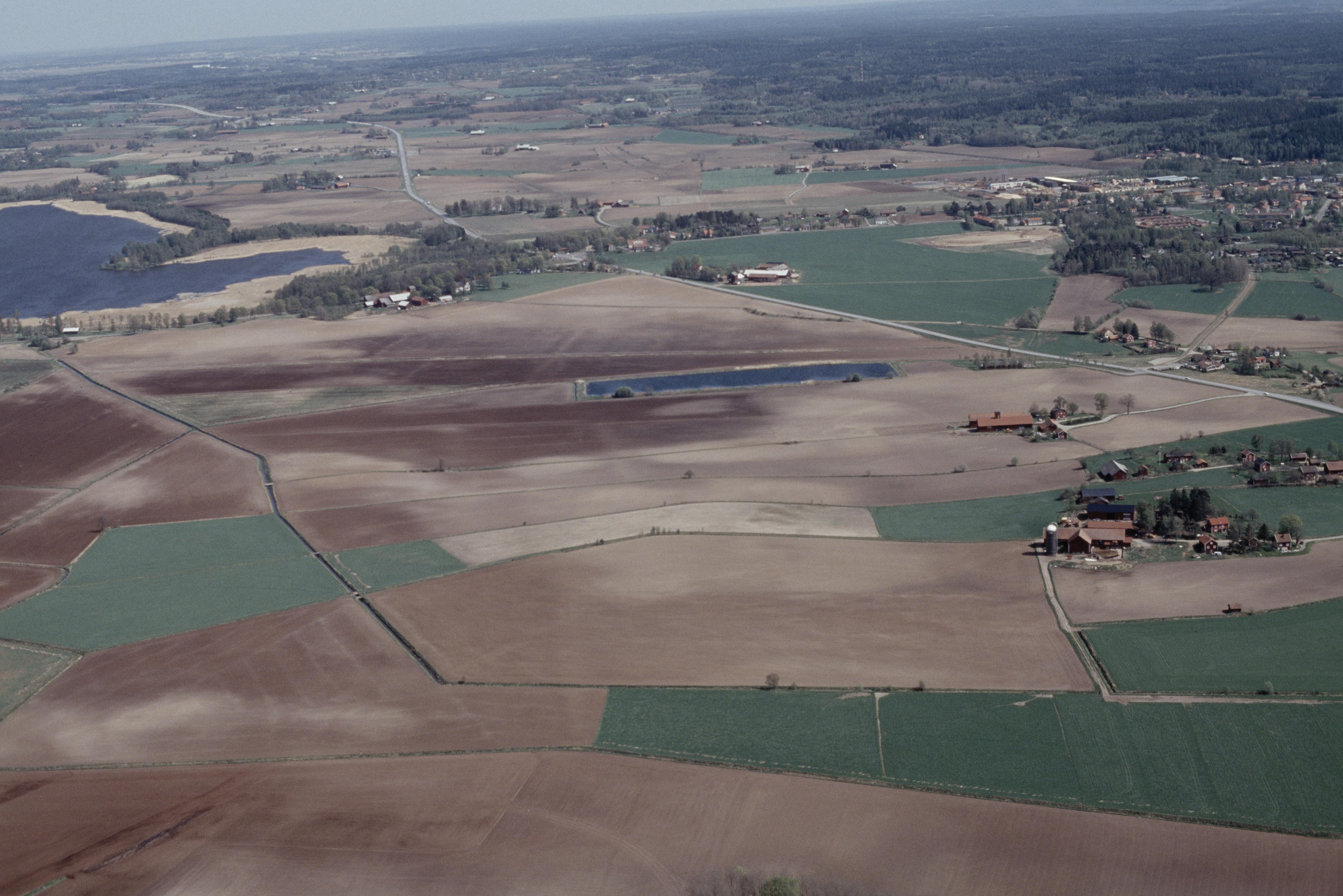 Beskrivning: Vibyslätten sydväst om Vibysjön, innan vägbygge av E3 / E20. Bytomt RAÄnr Viby 348 m.fl. Bilden är tagen mot (väderstreck): Ö
