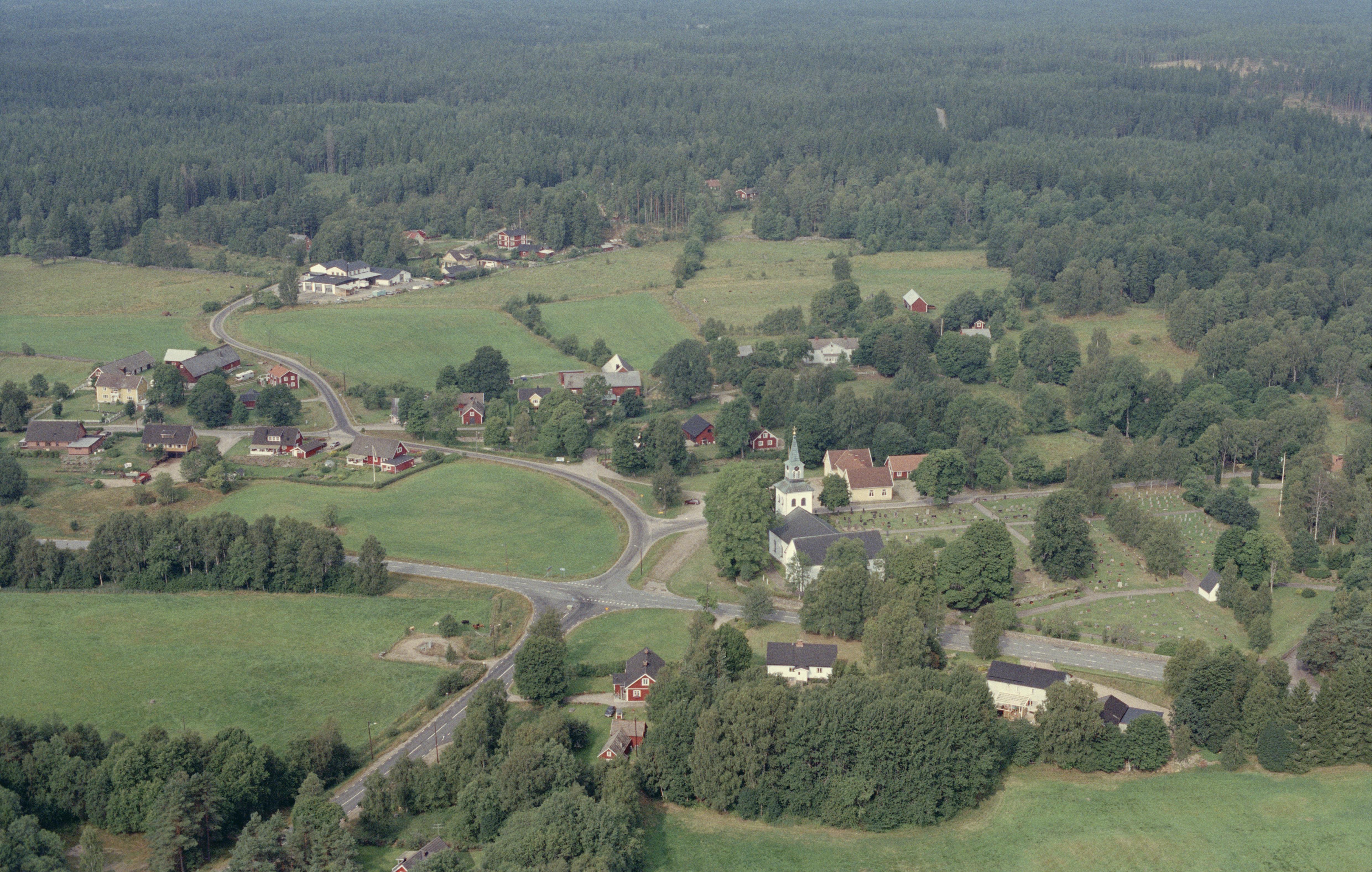 Beskrivning: Loshults kyrka och kyrkby. Bilden är tagen mot (väderstreck): NV