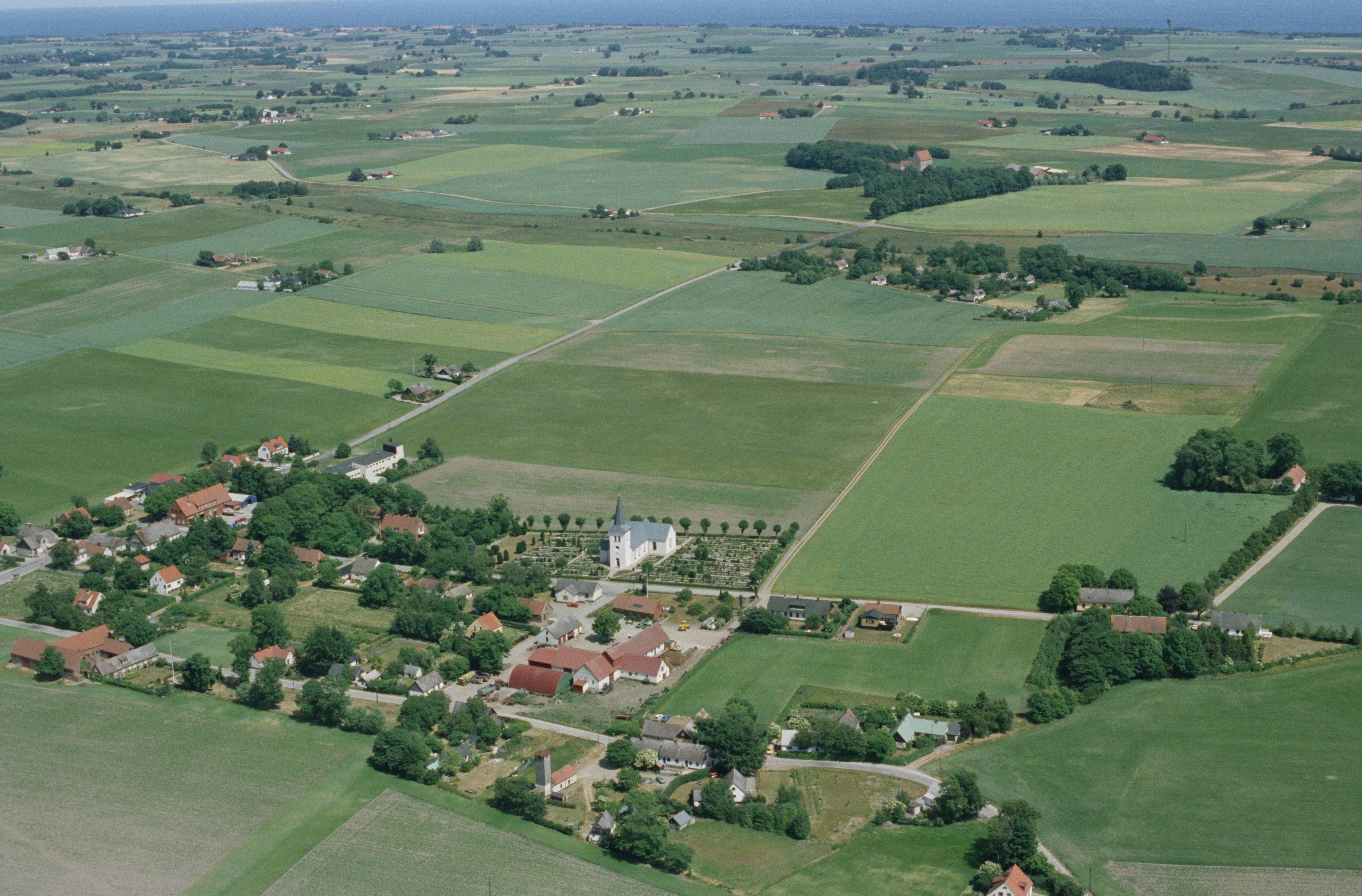 Beskrivning: Anmärkning (övrig): Riksintresse-nr/namn: L2 - Glimmingehus. Socken: Vallby. Motivering: Glimmingehus är Nordens bäst bevarade medeltidsborgarna i landet. (Borgmiljö). - Uttryck för riksintresset: Borgen är uppförd i sten i fyra våningar mellan åren 1499-1506. Den låg då på en holme omgiven av vallgrav och sankmarker. Idag ligger den monumentalt exponerad i det öppna odlingslandskapet. [Texten uppdaterat av Riksantikvarieämbetet våren 2013.] Beskrivning: Vallby kyrka och kyrkby. I bildens övre del Glimmingehus borg RAÄnr Vallby 5:1. Bilden är tagen mot (väderstreck): ONO Fotosyfte: Flygbildsdokumentation