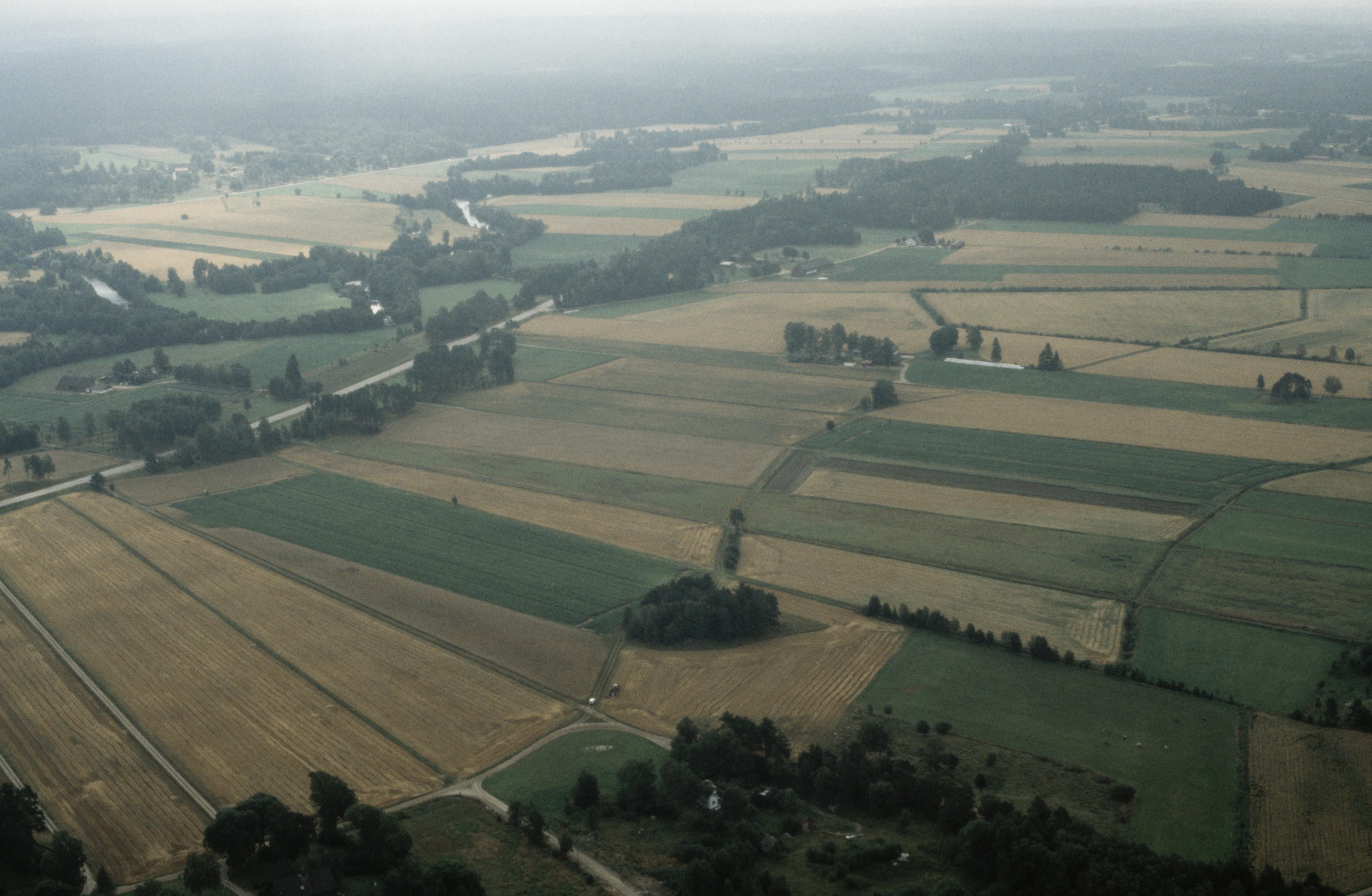 Beskrivning: Fornlämningstät område i ån Lagans dalgång vid Trotteslöv, Össlöv och Fallnaveka. Gravfält RAÄnr Berga 122:1 och 124:1 och hög Berga 123:1 i bildens nedre del. Bilden är tagen mot (väderstreck): SO