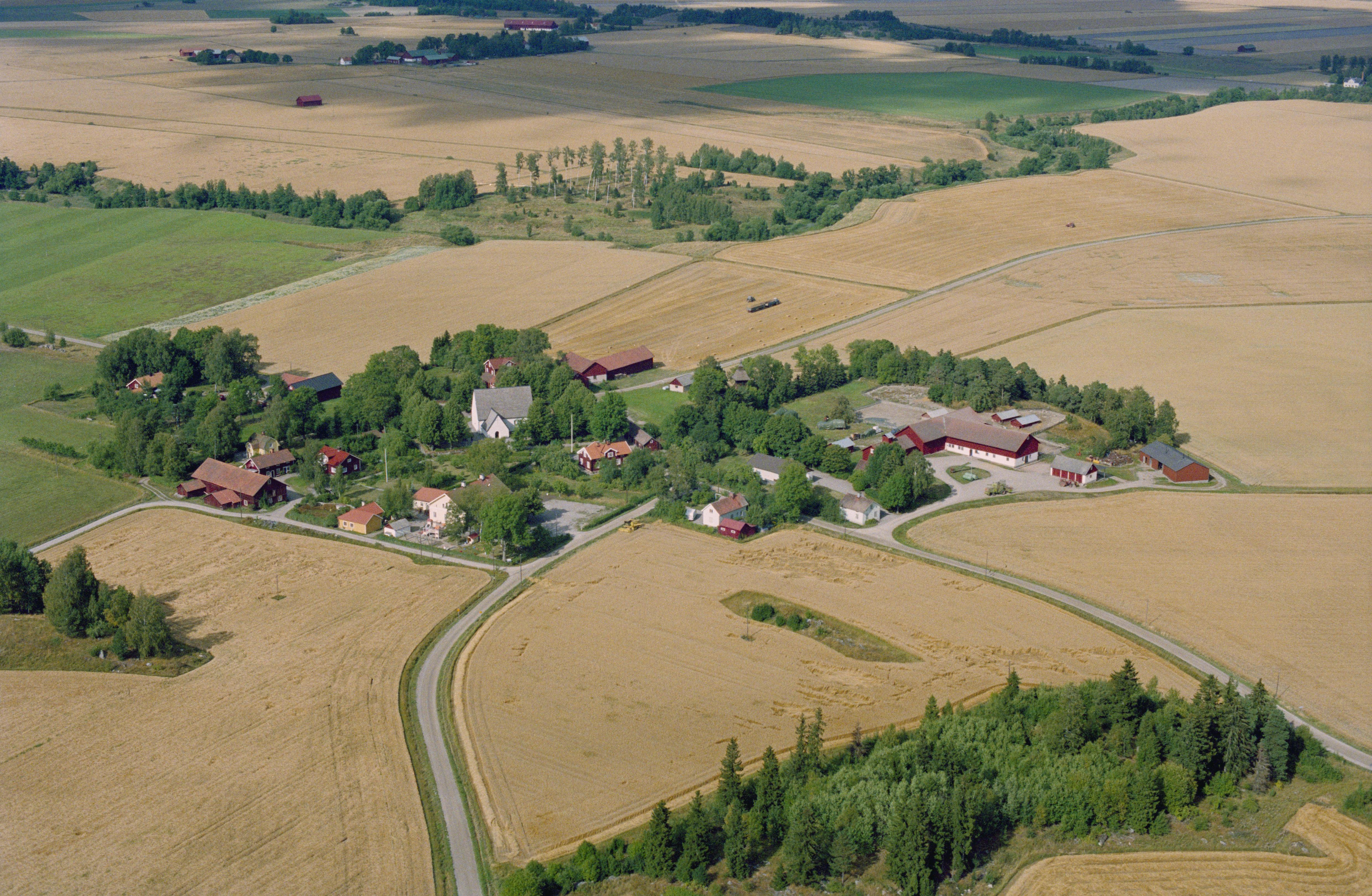 Beskrivning: Härnevi kyrka och kyrkby. I bildens övre del Örsundaån som markerar gränsen mot Torstuna socken. Bilden är tagen mot (väderstreck): NNO