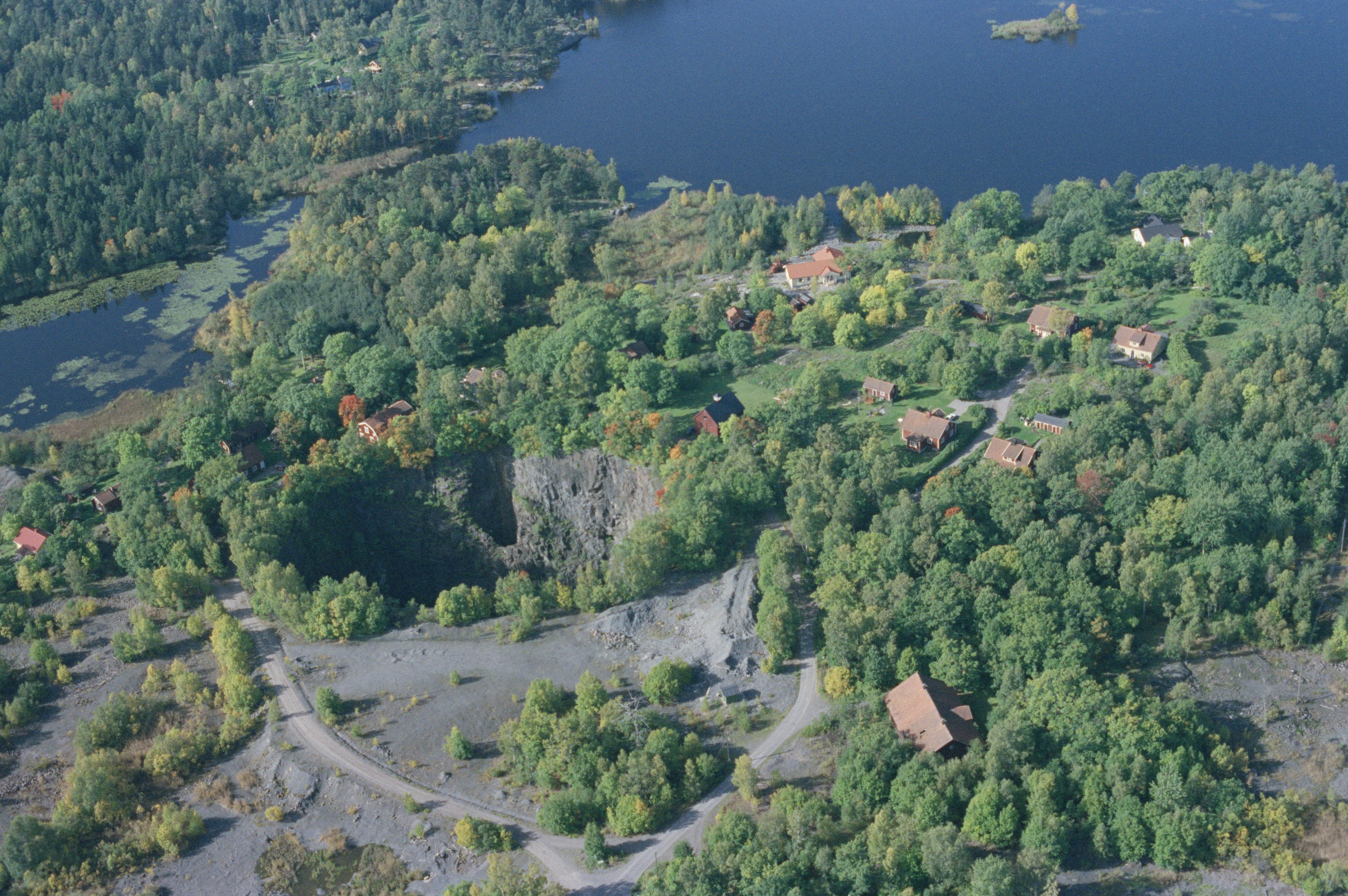 Beskrivning: Herrängs bruk, tätort och gruvområde vid Singöfjärden. Eknäsgruvan RAÄnr Häverö 356:1. Uppe i i bildens övre del sjön Blåkaren. Bilden är tagen mot (väderstreck): SV
