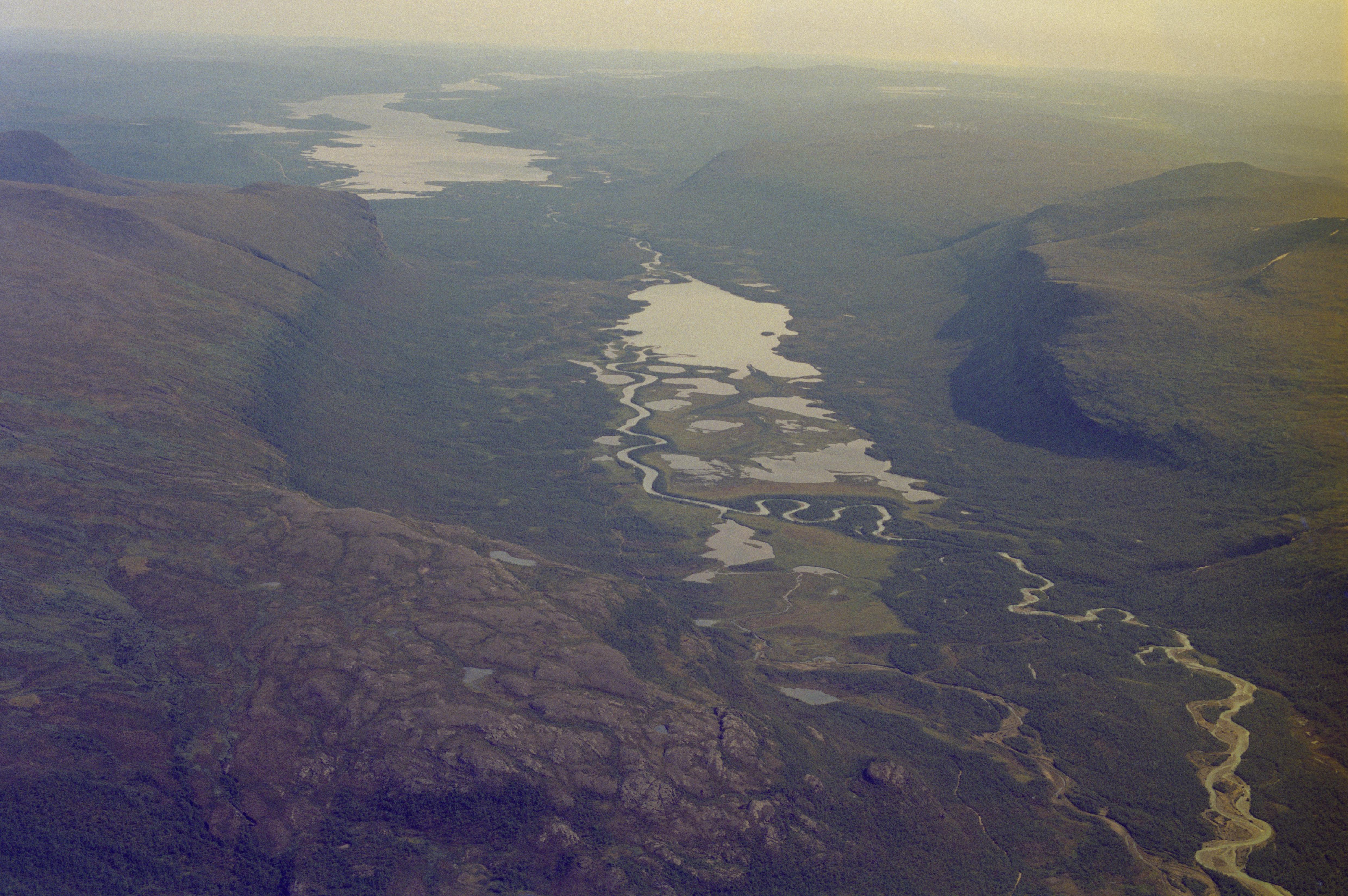 Beskrivning: Dalgången från området Ladtjovagge (Láddjuvággi) mot sjöarna Ladtjojaure (Láddjujávri) och Paittasjärvi (Báittasjávri) mellan dessa orten Nikkaluokta (Nihkáluokta). Längs norra sidan av dalgången går vägen Dag Hammarskiöldsleden. Till vänster om bildens mitt husgrund RAÄnr Jukkasjärvi 71:1. Bilden är tagen mot (väderstreck): Ö