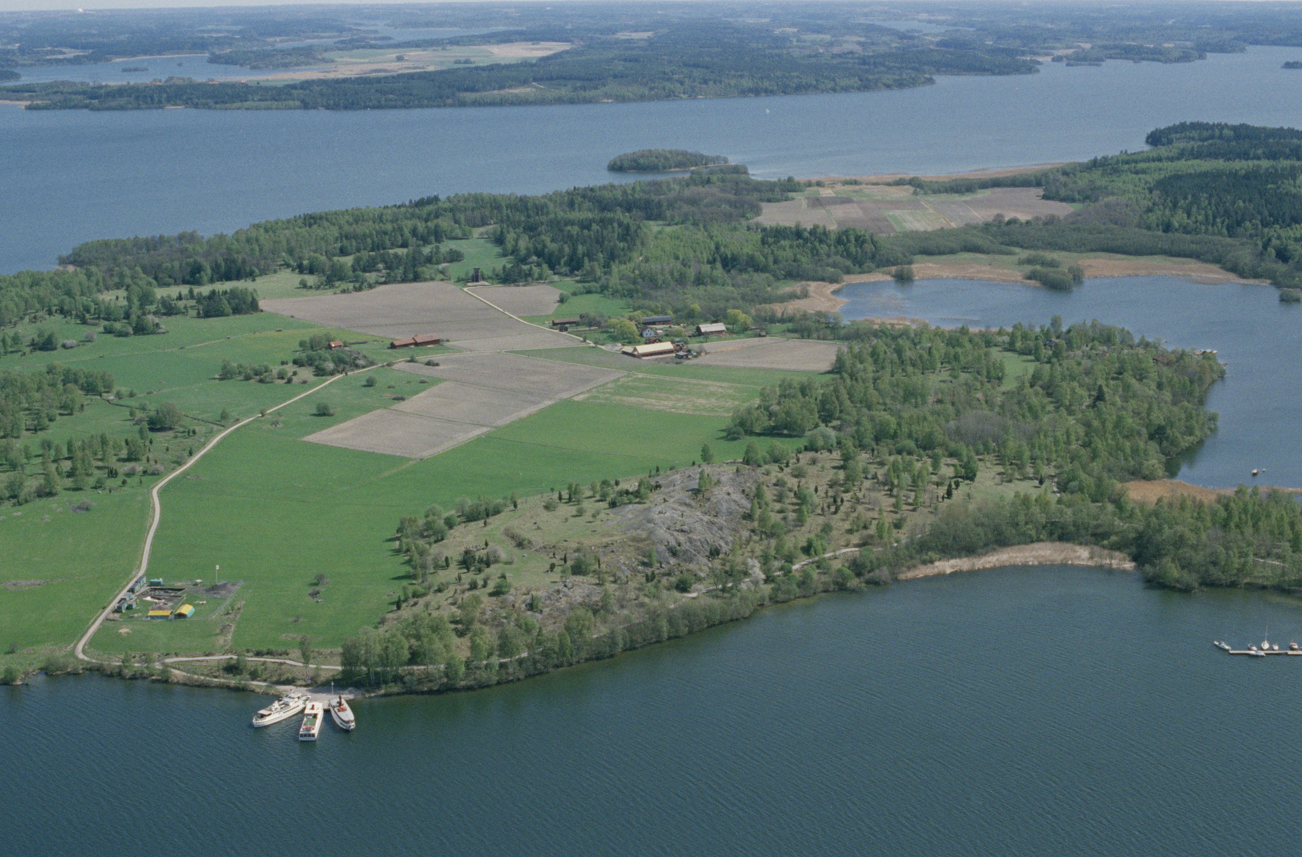 Beskrivning: Fornlämningsområdet Birka på Björkö i Mälaren. Arkeologisk undersökning i norra delen av ön i bo- och gravplats Hemlanden och Svarta jorden RAÄnr Adelsö 118:1 vid Stadsvallen Adelsö 119:1-2 och fornborg Borg Adelsö 34:1. Grindsbacka och Björkö by vid bildens mitt. Bilden är tagen mot (väderstreck): Ö