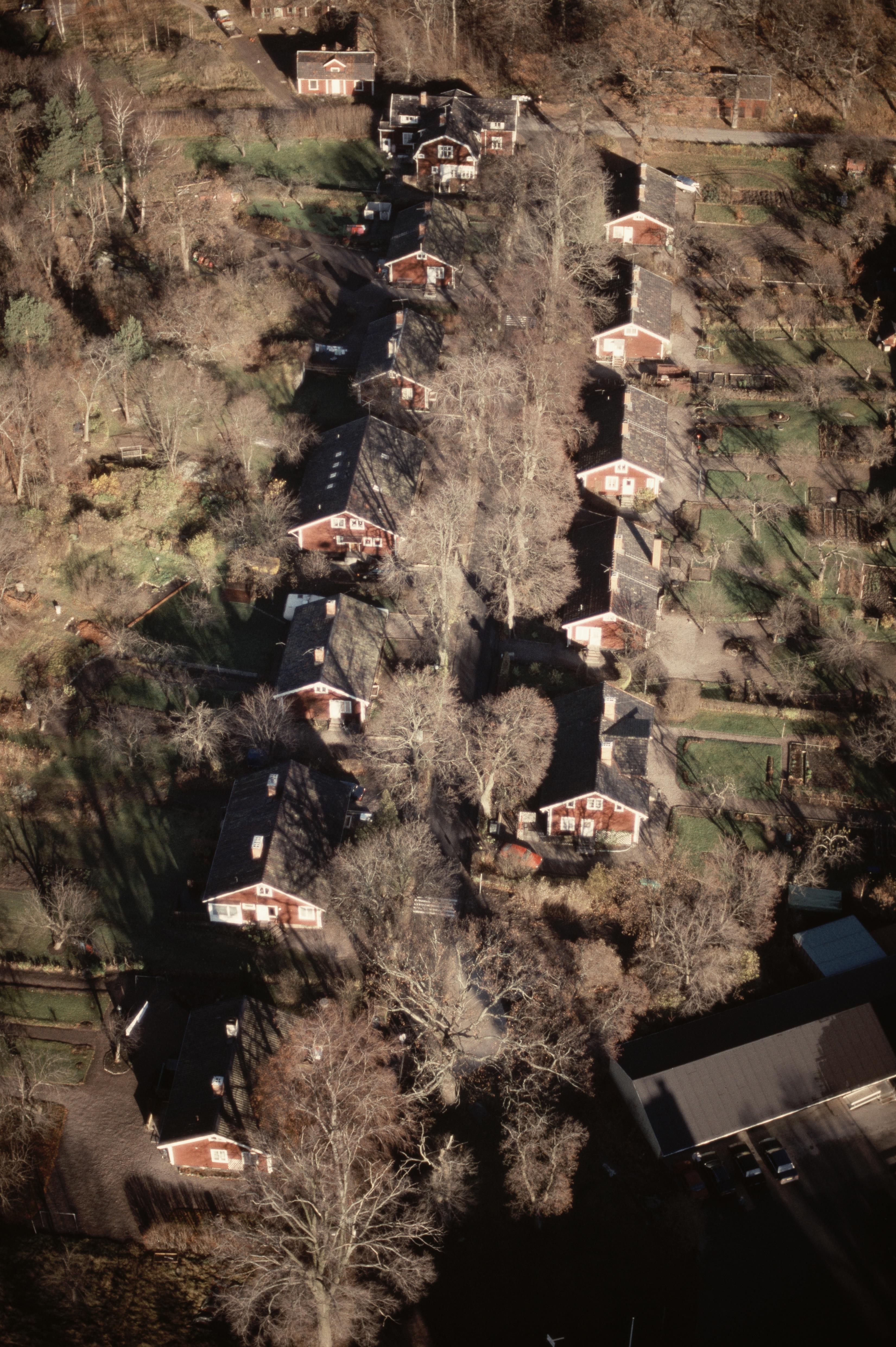 Beskrivning: Gustavsbergs tätort. Arbetarbostäder för porslinsfabriken. Grindstugatan RAÄnr Gustavsberg 36:1. Största byggnaden i i bildens övre kant är det Gamla apoteket. Bilden är tagen mot (väderstreck): NNO