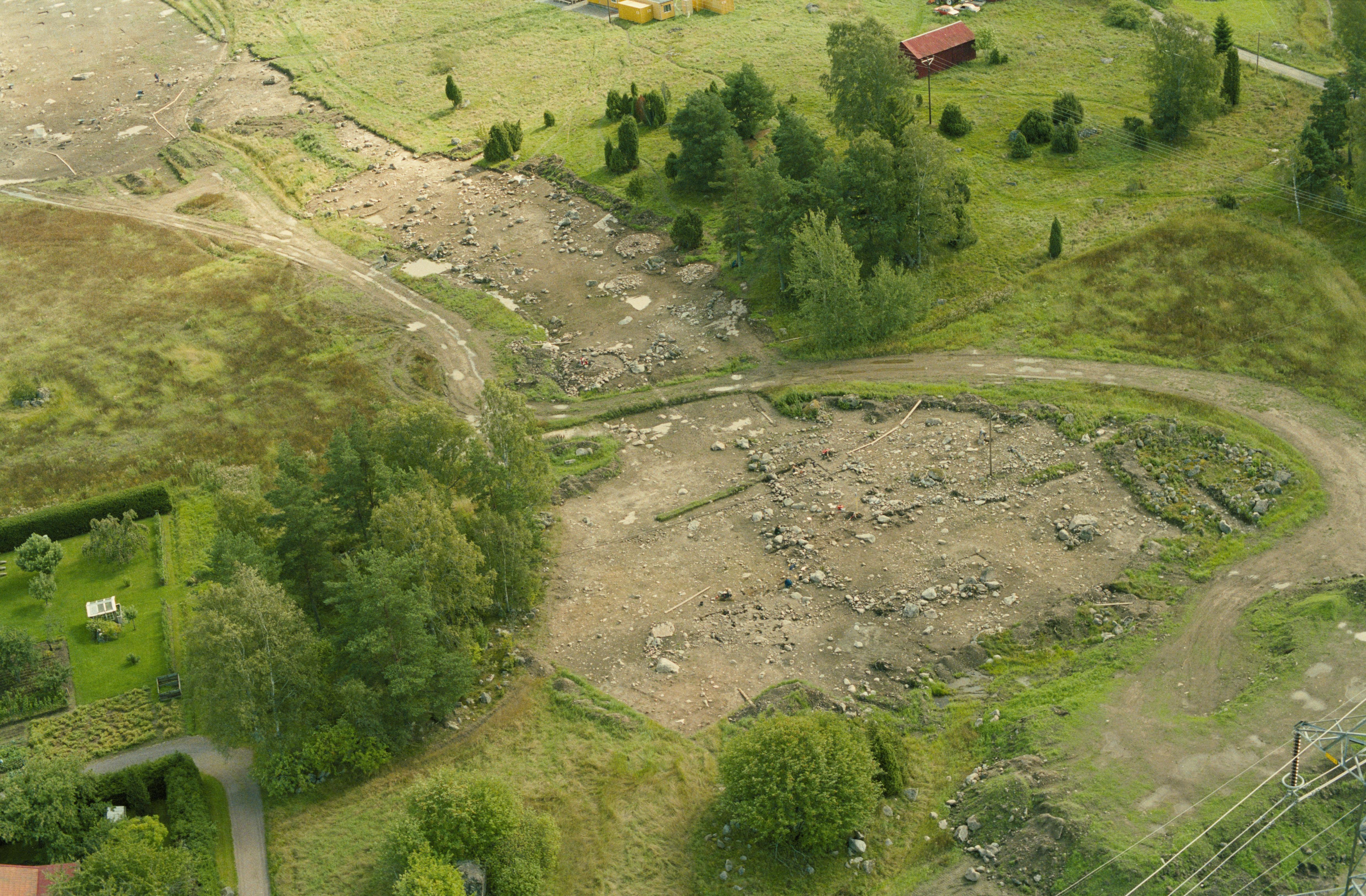 Beskrivning: Beskrivning: Arkeologisk undersökning innan bygge av järnväg (Arlandabanan) i Rickebyåns dalgång i områden sydost om Svartsjön. Bo- och gravplats Odensala 11:1, 402:1-2, gravplats Odensala 13:1, boplats Odensala 489:1, m.fl. Bilden är tagen mot (väderstreck): SO Fotosyfte: Flygbildsdokumentation
