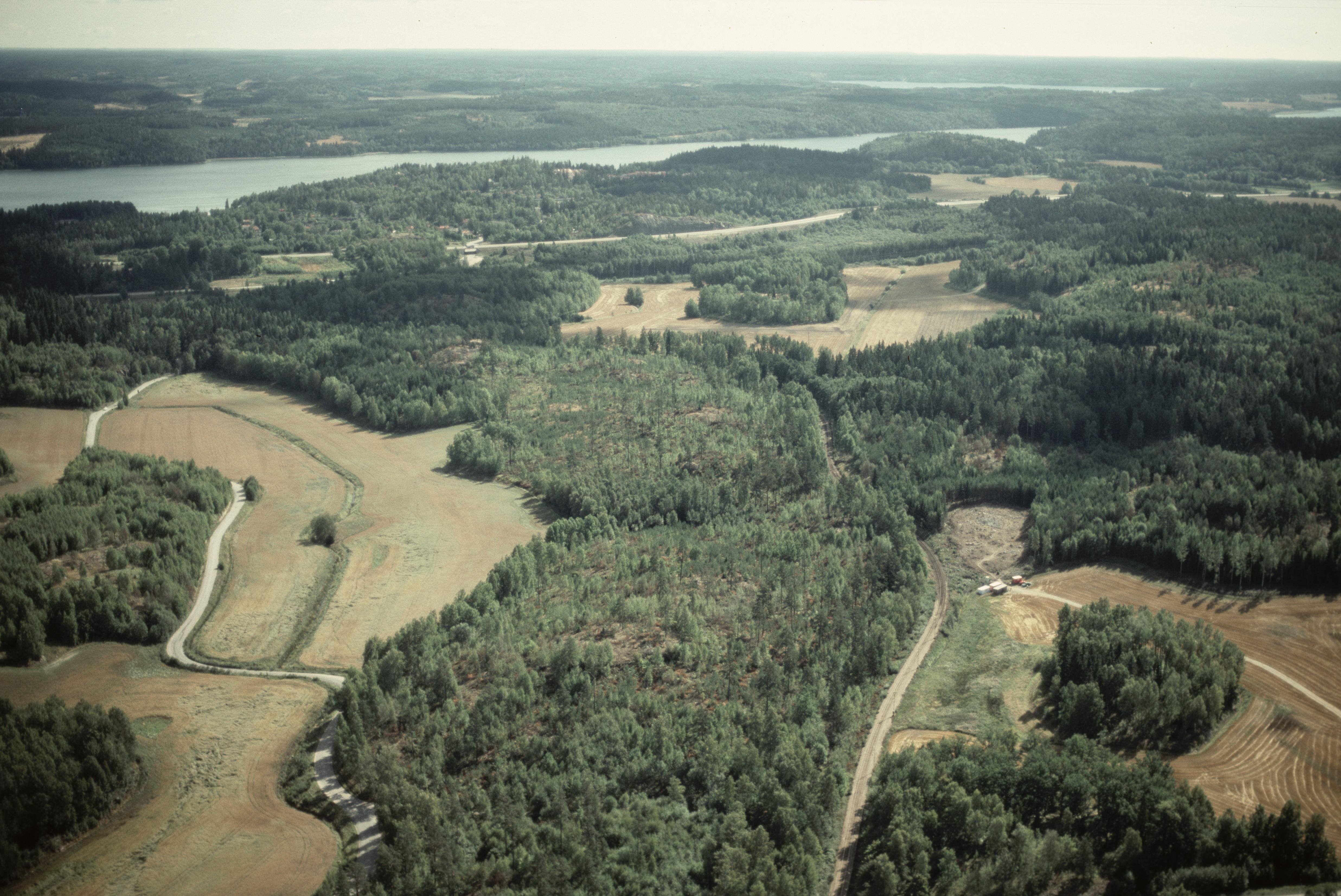 Beskrivning: Nere till höger arkeologisk undersökning innan järnvägen Grödingebanan byggs. Vid bildens mitt boplats RAÄnr Tveta 164:1 vid den gamla järnvägssträckan. I bildens övre del Pershagen i Södertälje vid Hallsfjärden. Bilden är tagen mot (väderstreck): Ö