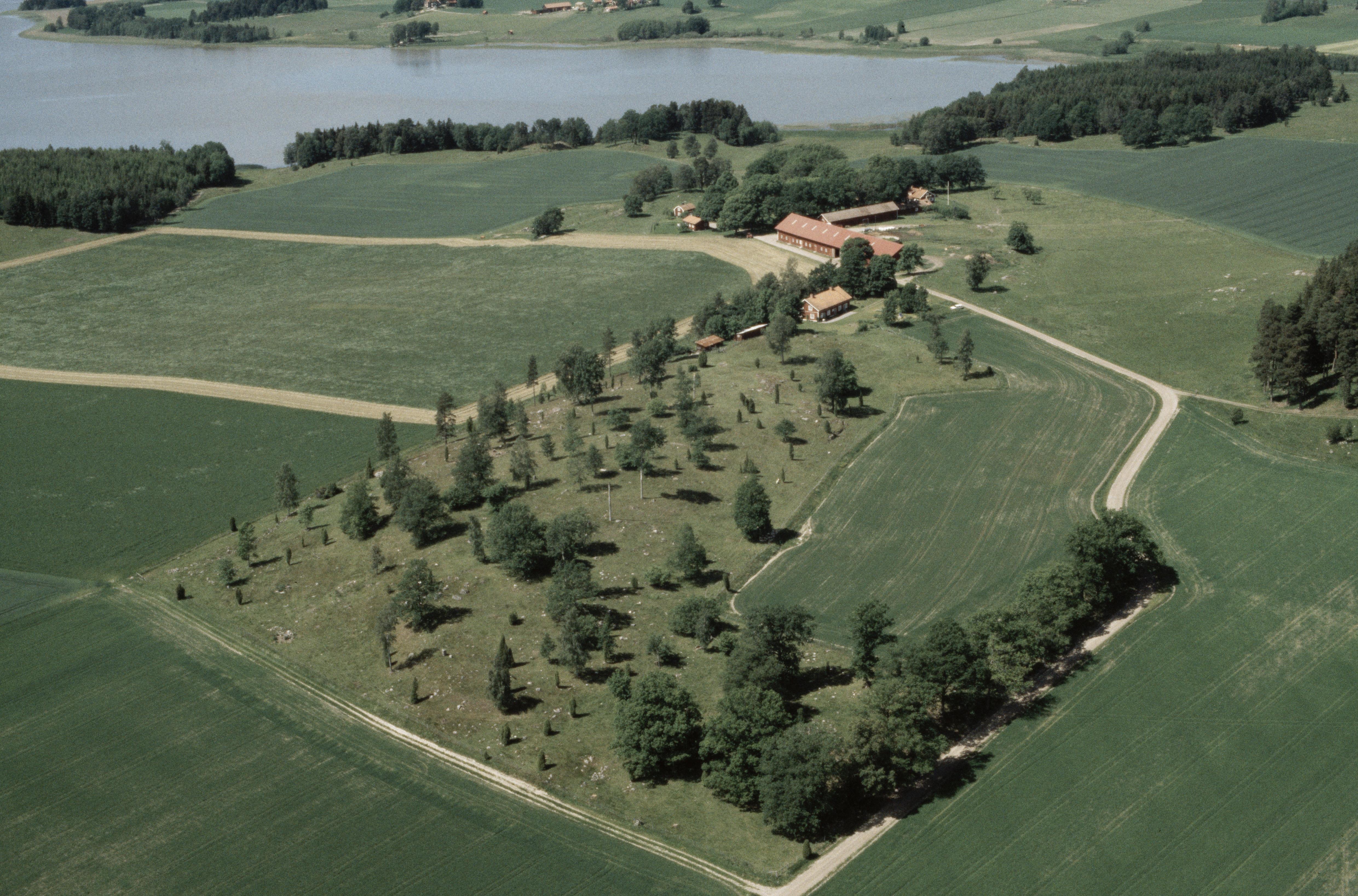 Beskrivning: Gravfält RAÄnr Spelvik 5:1. Landshammars gård vid sjön Eknaren. Bilden är tagen mot (väderstreck): NV