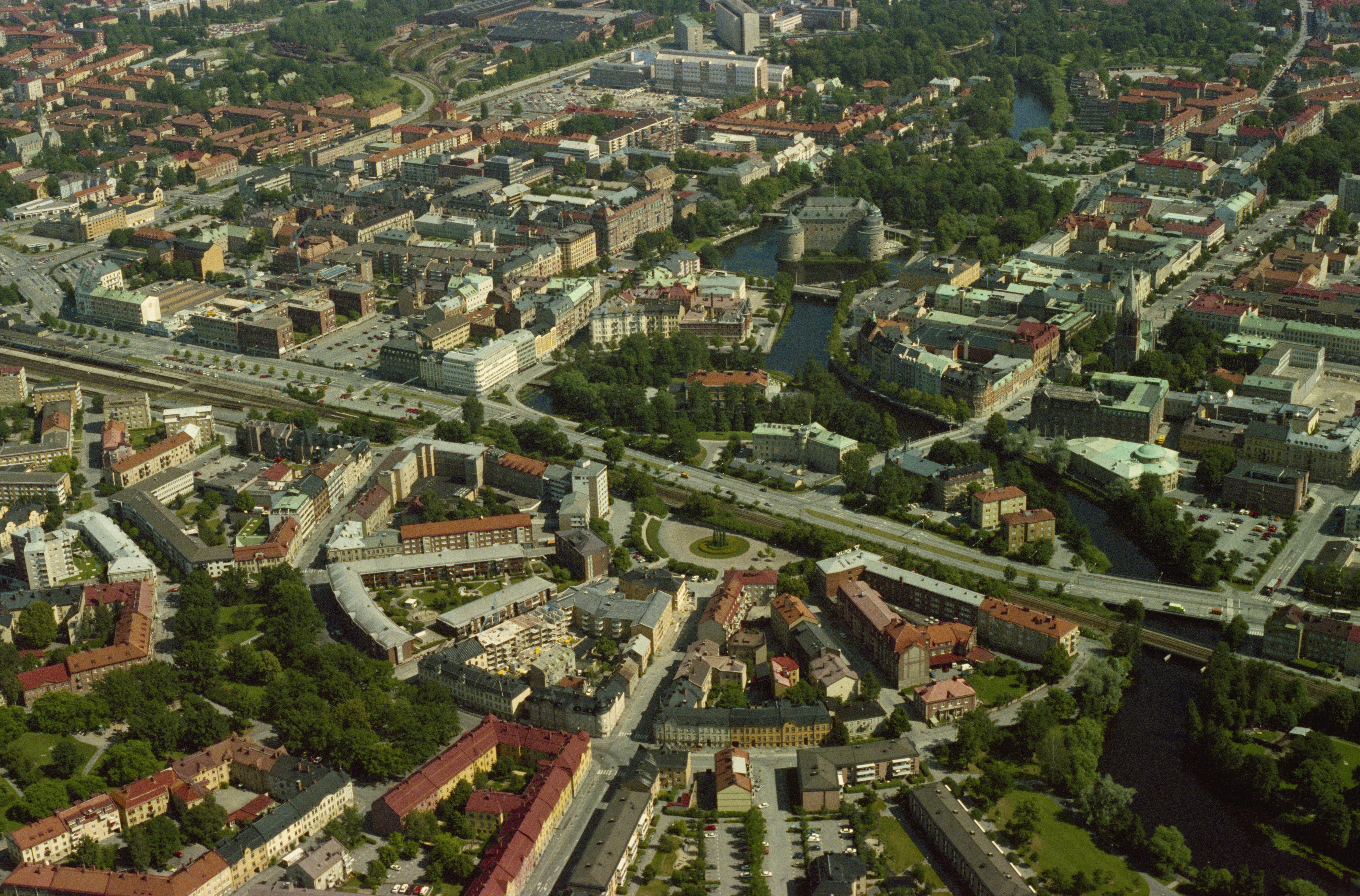 Beskrivning: Svartån i Örebro stad. Örebro slott i bildens övre del, Sankt Nicolai kyrka till höger. Bilden är tagen mot (väderstreck): Ö