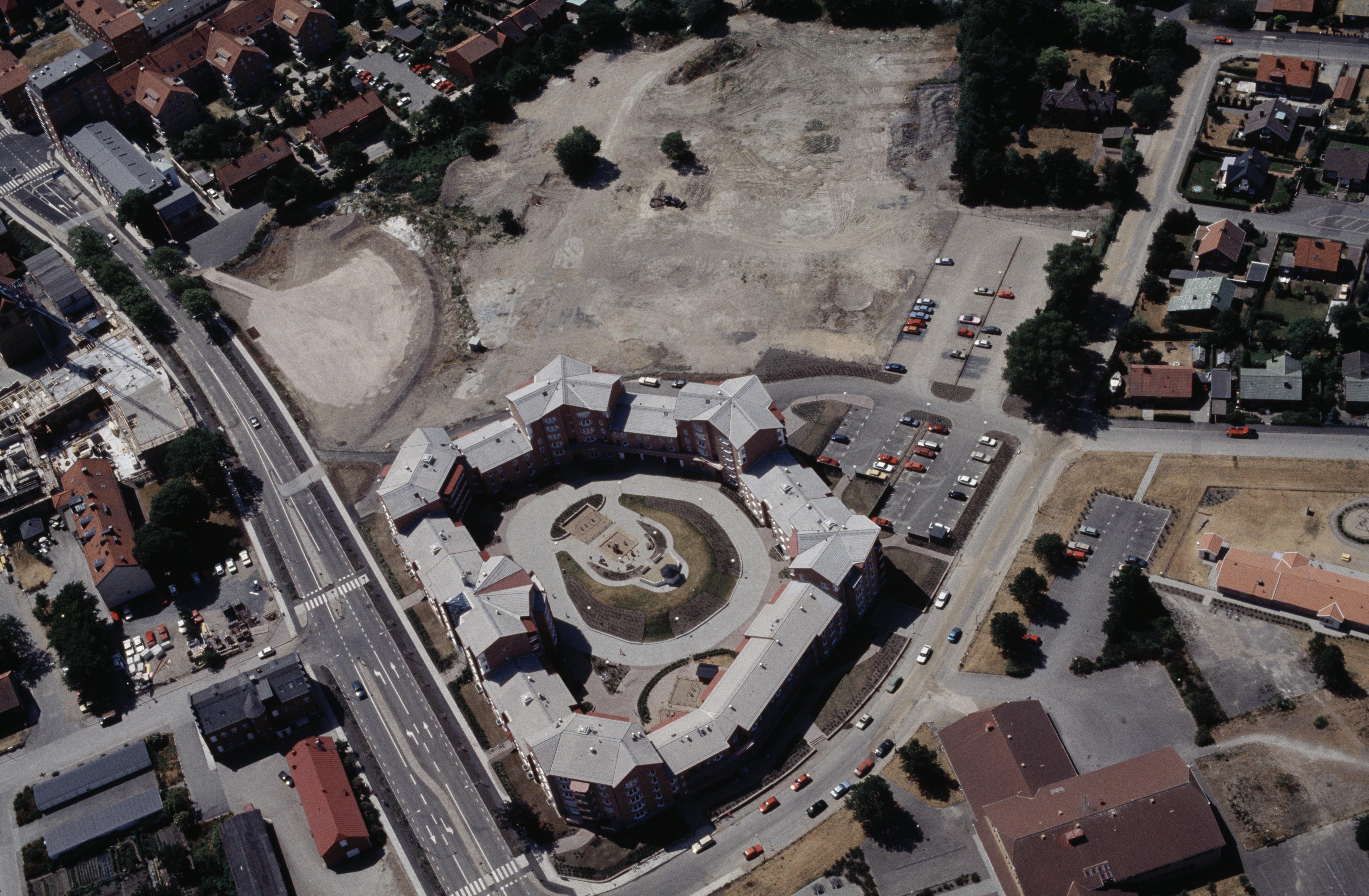 Beskrivning: Trelleborgs stad. Trelleborgs sjöfartsmuseum. Arkeologisk undersökning av fornborg "Trelleborgen" RAÄnr Trelleborg 48 i bildens övre del. Bilden är tagen mot (väderstreck): SV