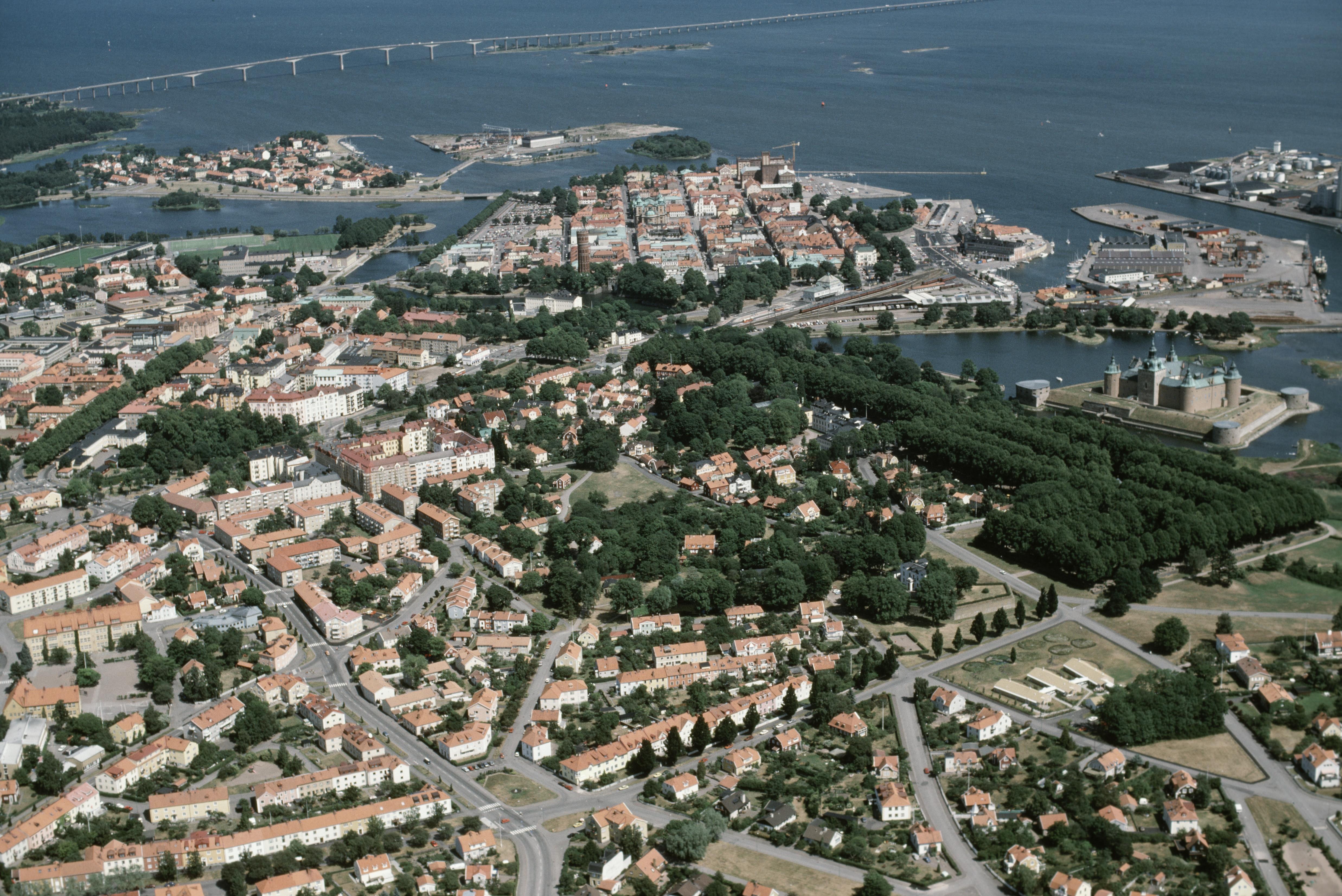 Beskrivning: Kalmar stad. Kvarnholmen med Kalmar domkyrka i bildens övre del. Kalmar slott / borg RAÄnr Kalmar 53:1 till höger om bildens mitt. Bilden är tagen mot (väderstreck): ONO