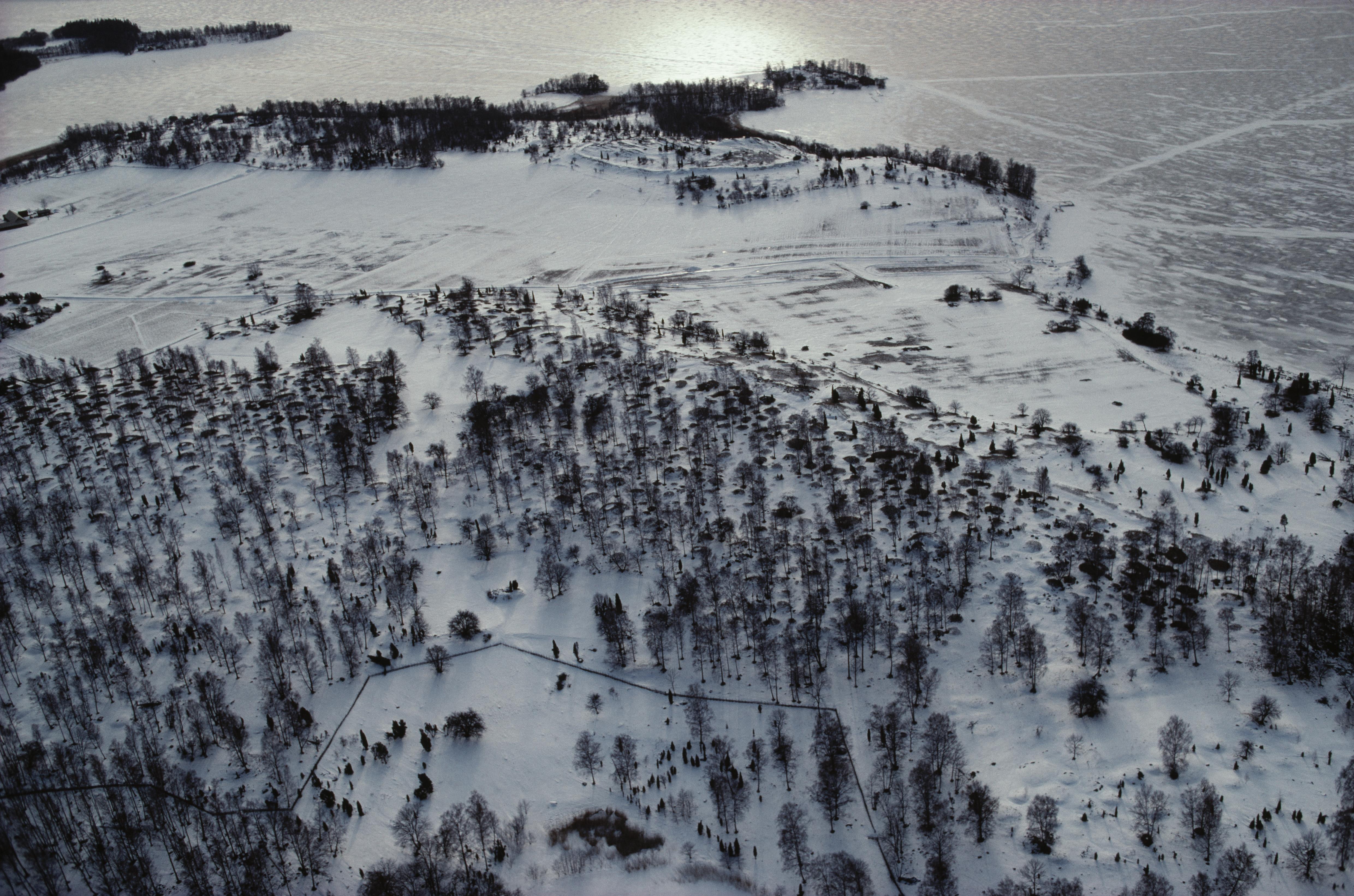 Beskrivning: Fornlämningsområdet Birka på Björkö i Mälaren. Norra delen av ön vid bo- och gravplats Hemlanden och Svarta jorden RAÄnr Adelsö 118:1 vid Stadsvallen Adelsö 119:1-2 m.fl. I bildens övre del gravfält Borgs hage RAÄnr Adelsö 35:1 och fornborg Borg Adelsö 34:1 vid Ångholmen. Bilden är tagen mot (väderstreck): SV