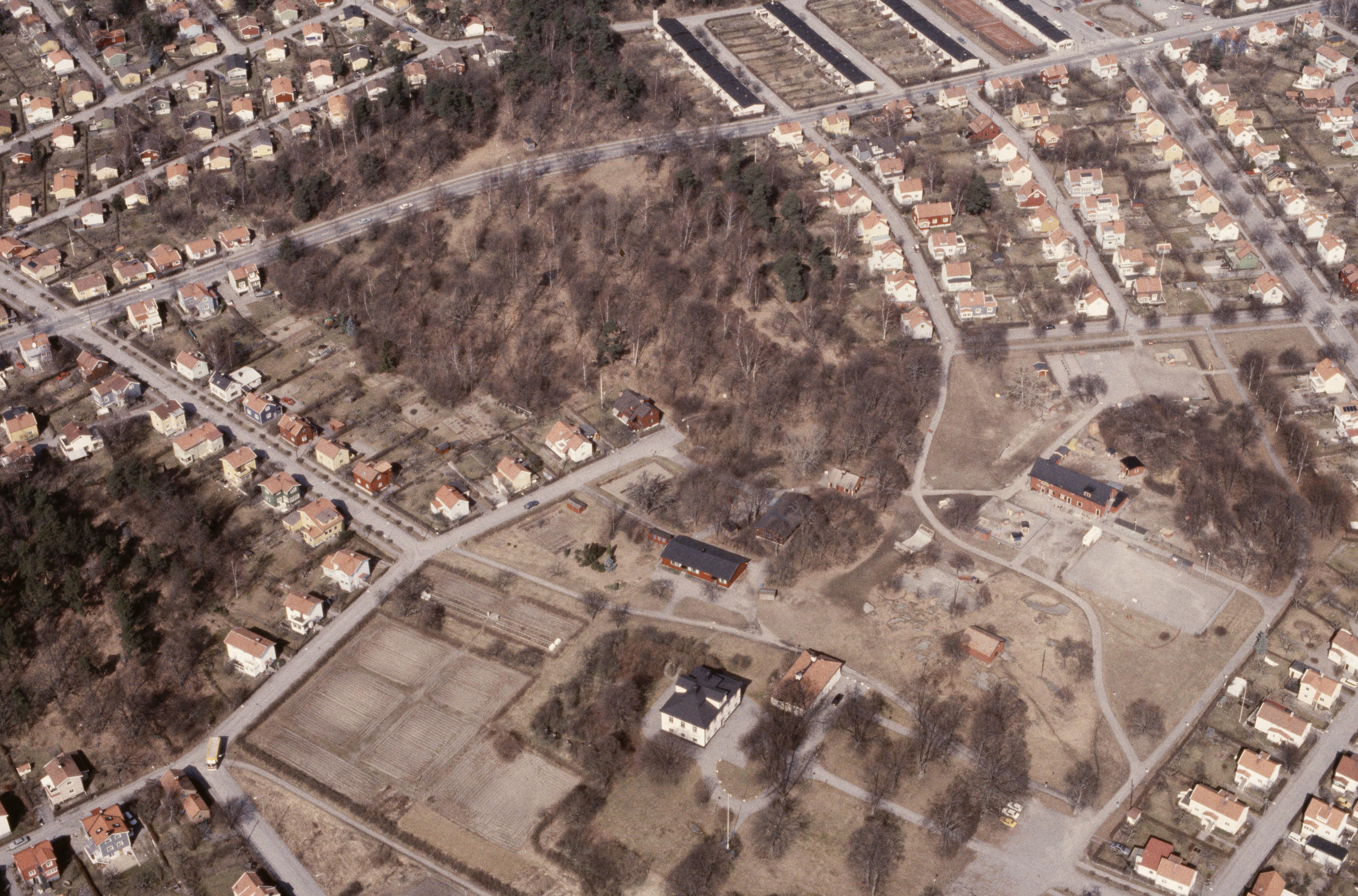 Beskrivning: Området Norra Ängby i stadsdelen Bromma i Stockholms Västerort. Över bildens mitt gravfält Björklunds hage RAÄnr Bromma 62:1. I bildens nedre del Stora Ängby herrgård i Norra Ängby. Bilden är tagen mot (väderstreck): NV