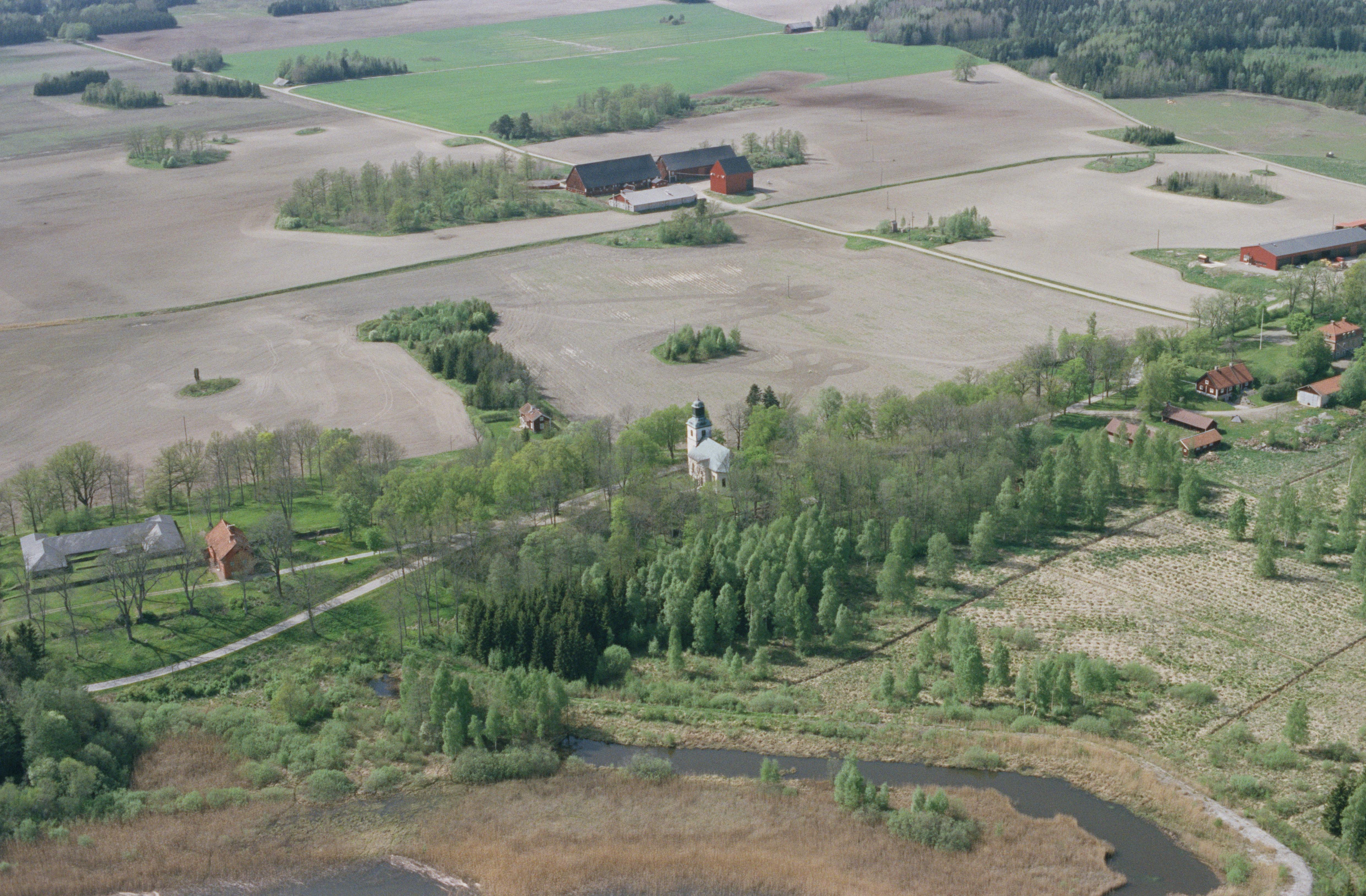 Beskrivning: Ödeby kyrka. I bildens nedre del till vänster slottsruin Kägleholm RAÄnr Ödeby 8:1 (under grått skiffertak). Till höger Kägleholms herrgård / säteri. Bilden är tagen mot (väderstreck): NV
