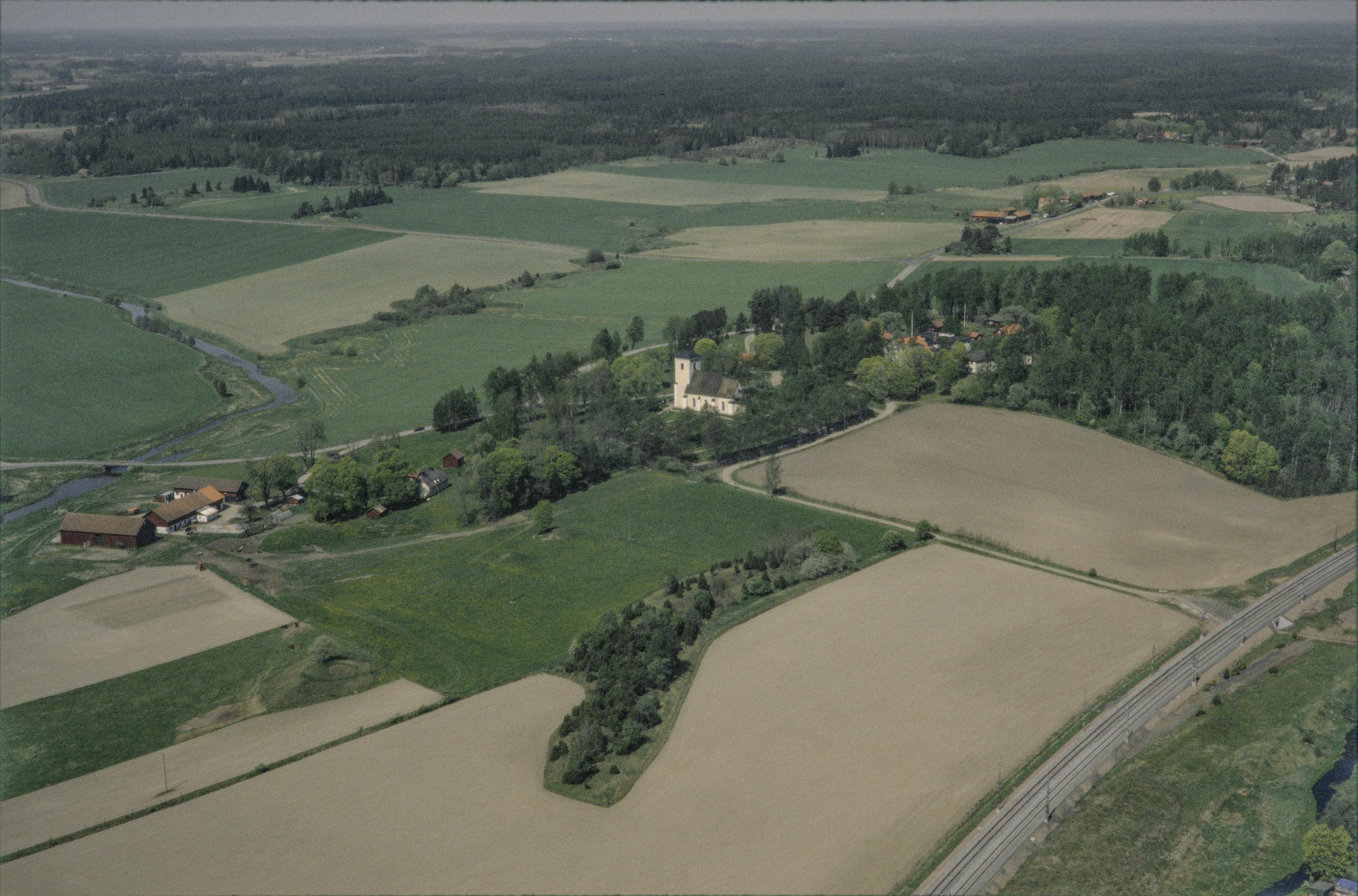 Beskrivning: Lena kyrka och kyrkby. Fyrisån till vänster. Bilden är tagen mot (väderstreck): N