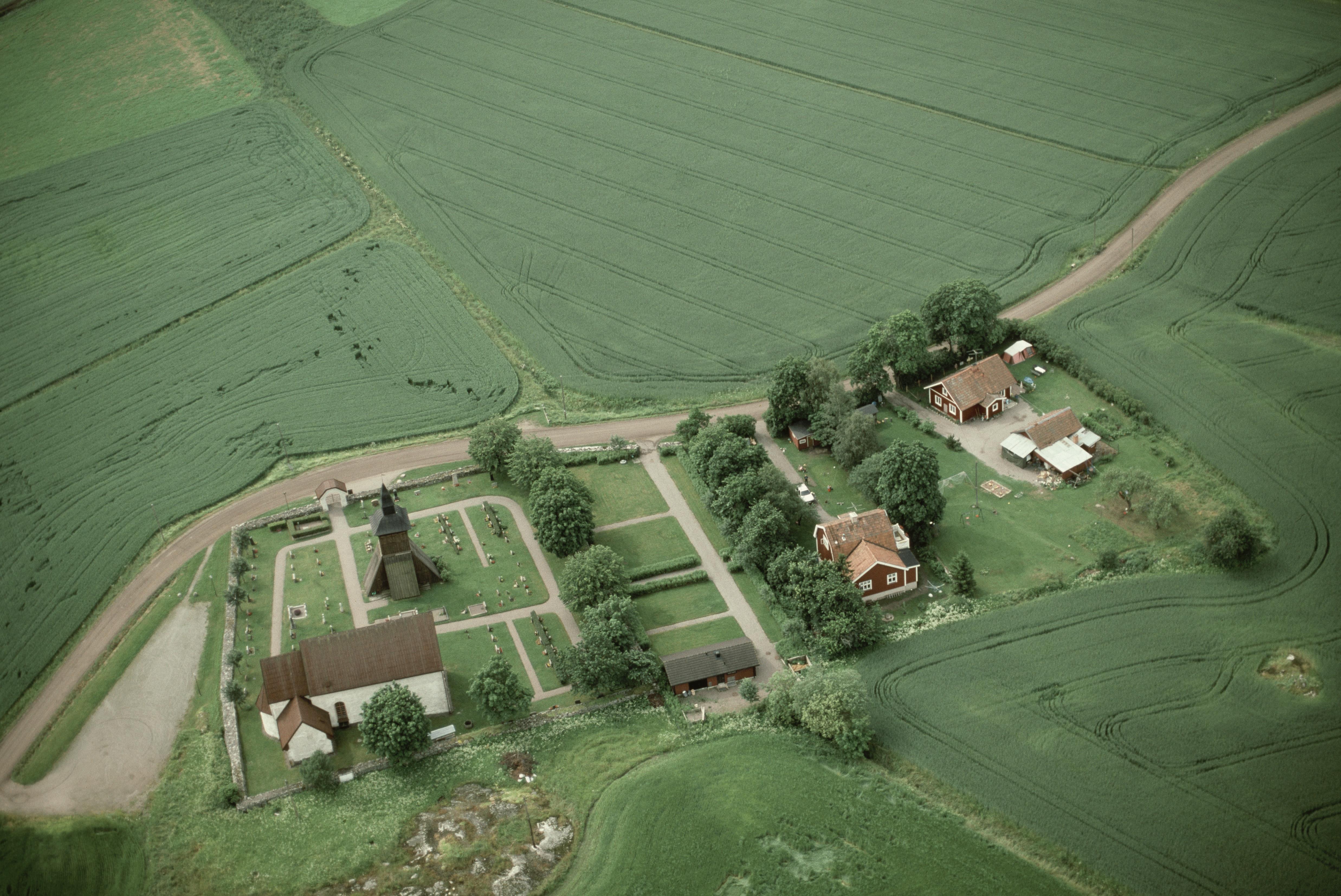Beskrivning: Orkesta kyrka och kyrkby. Bilden är tagen mot (väderstreck): S