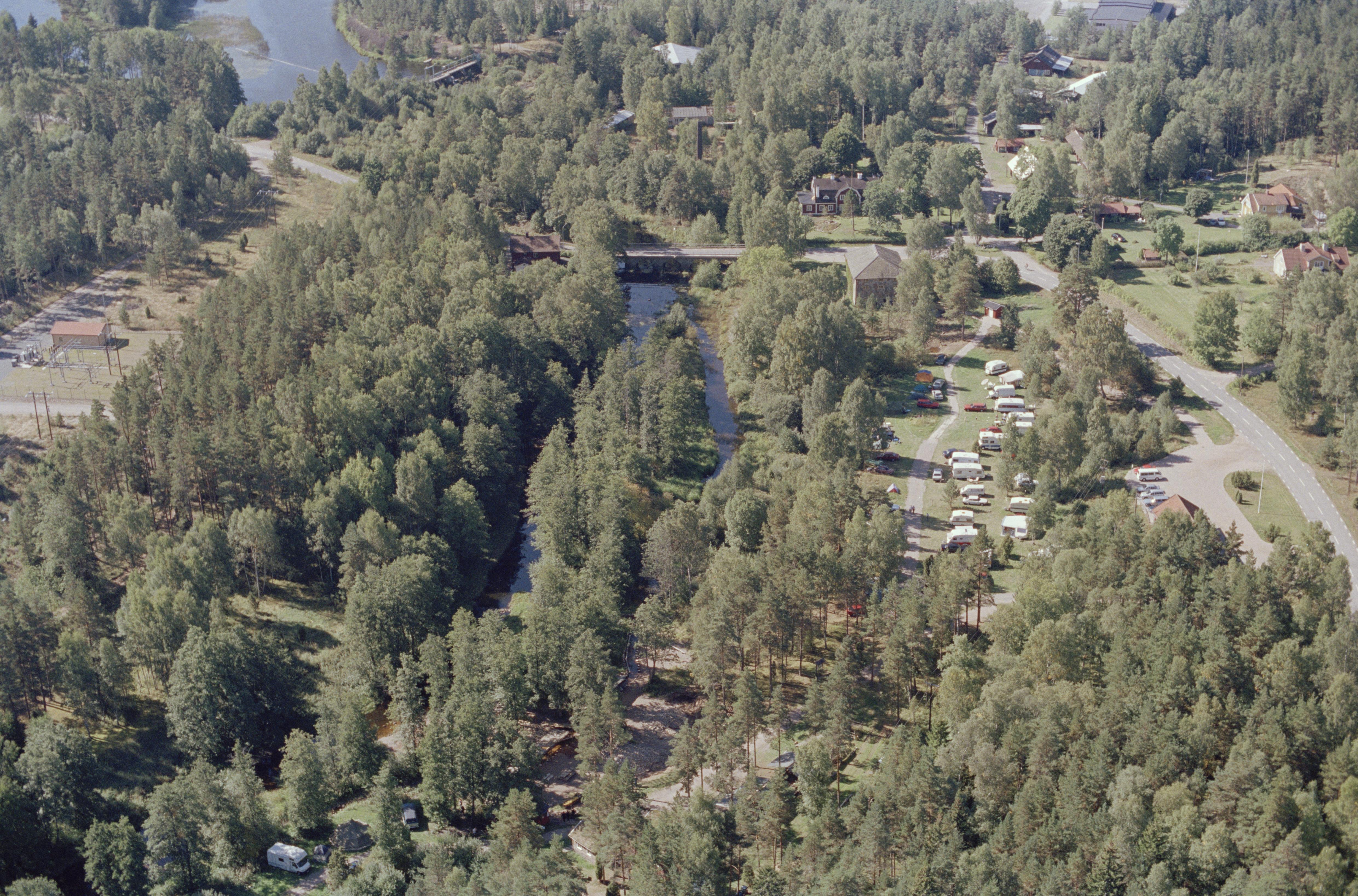 Beskrivning: Ädelfors bruk RAÄnr Alseda 45:1-12 m.fl. Emån vid Åstugan, Ädelfors gruva och campingplatsen. Diverse industrilämningar och museum. Bilden är tagen mot (väderstreck): V