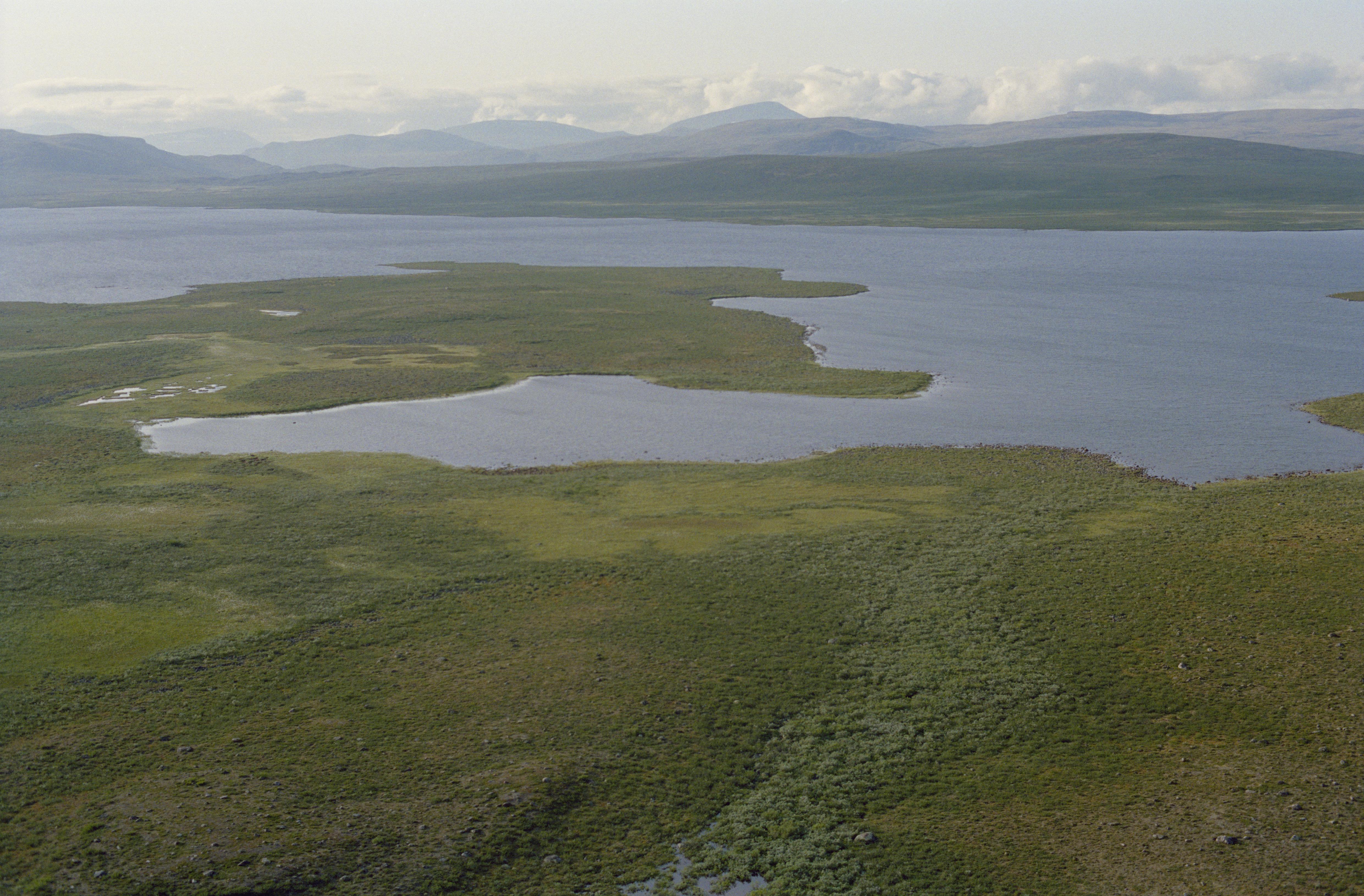 Beskrivning: Sjön Kiepanjaure (Giehpanjávri / Kiehpanjärvi), sydöstra stranden vid området Giehpangielas och stora udden. I bildens övre del fjällen Stuor Tuoipai och Duoibal längs sjöns nordvästra strand. Bilden är tagen mot (väderstreck): NV