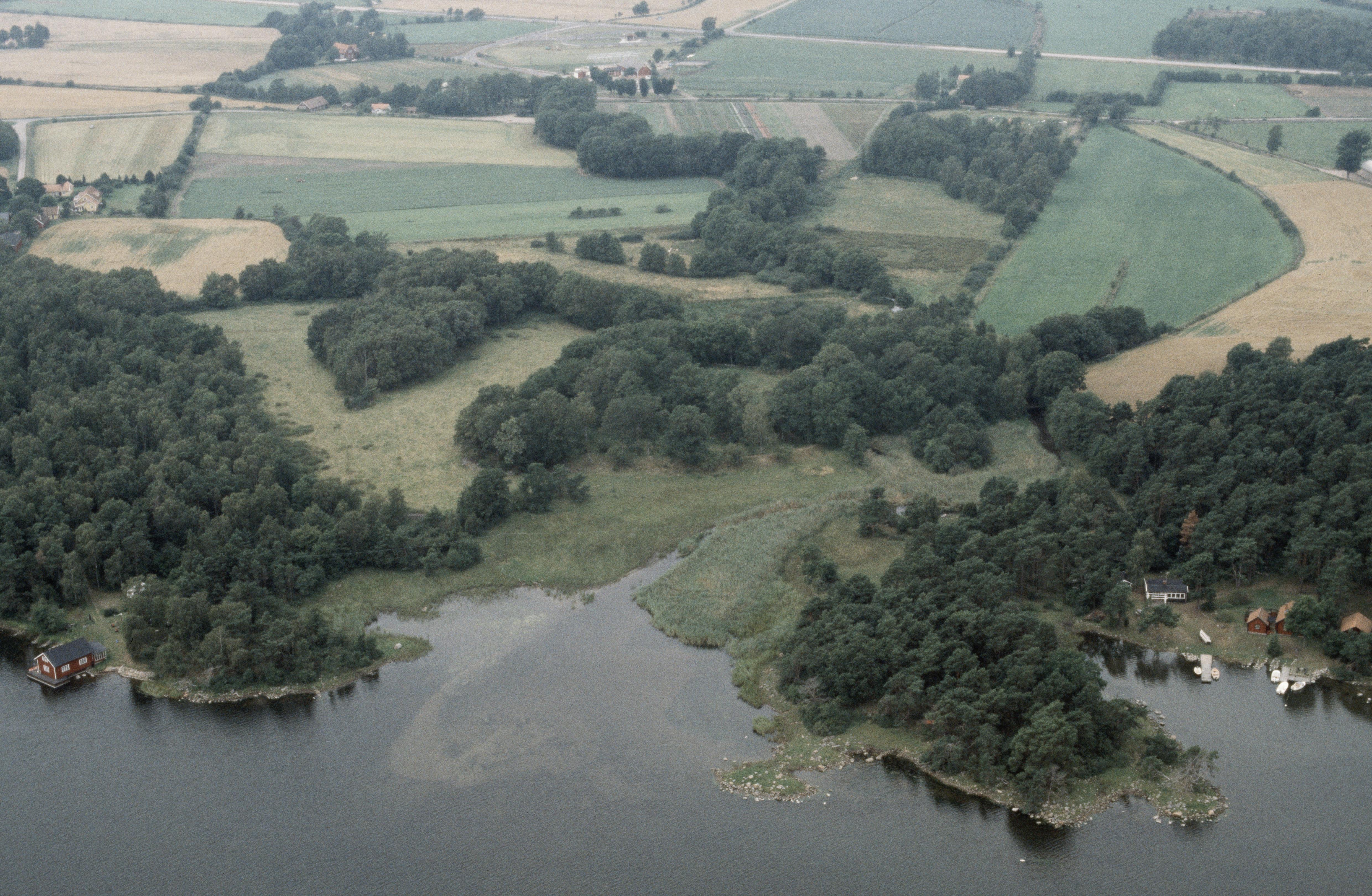 Ån Brömsebäck markerar gränsen Kristianopel/Söderåkra s:nr och gränsen Småland/Blekinge. Borg Brömsehus RAÄnr Kristianopel 1:1 t.v. I bildens högra del Bröms i Söderåkra sn och Riksintressen "H39 - Bröms och "H101 - Grisbäck". Bilden är tagen mot (väderstreck): V