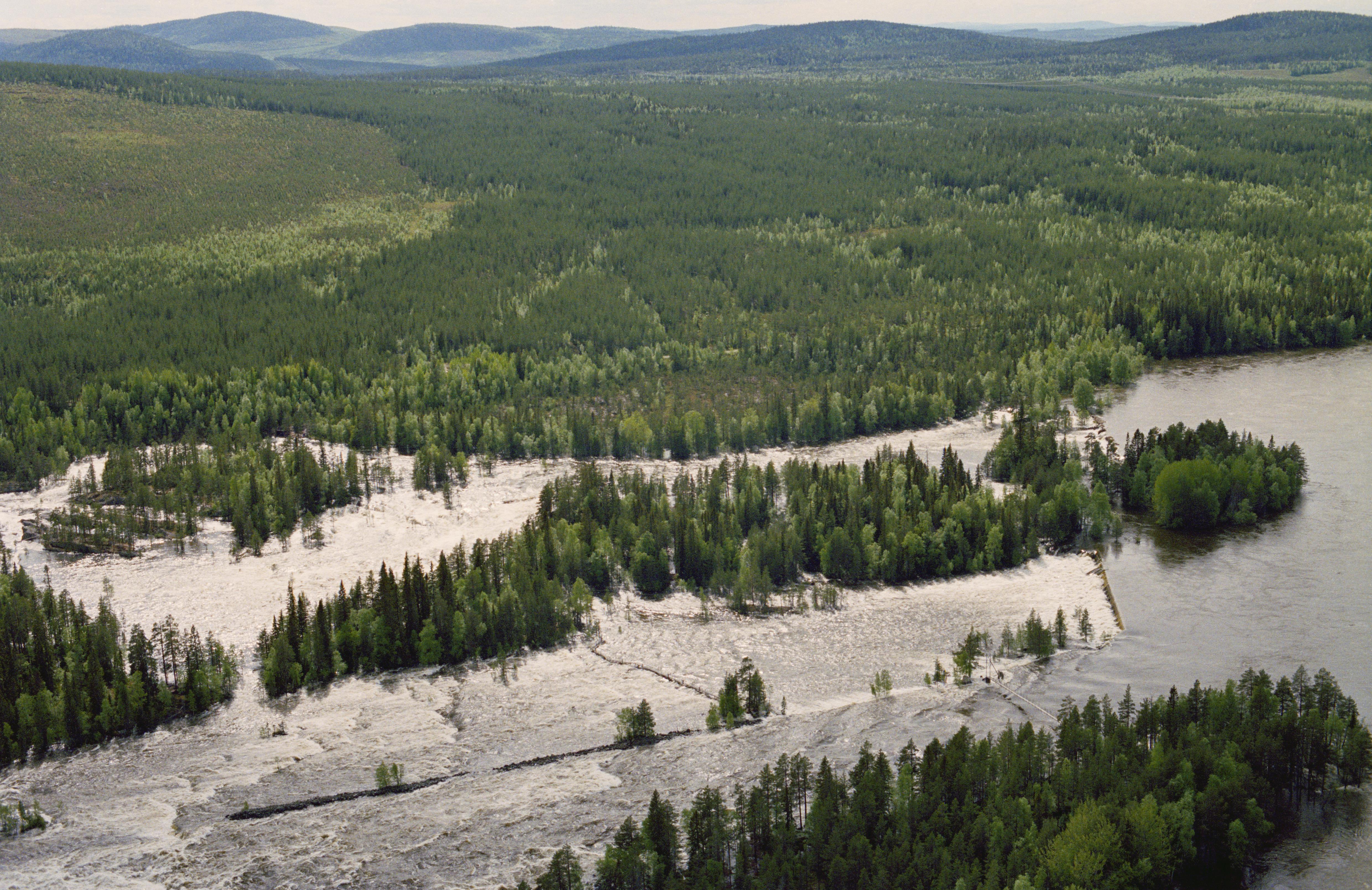 Beskrivning: Mårdseleforsen (skrivs även Mårdselforsen) i Vindeälven. Boplats RAÄnr Degerfors 602:1 vid Nedre Sikselet till höger under bildens mitt. Bilden är tagen mot (väderstreck): S