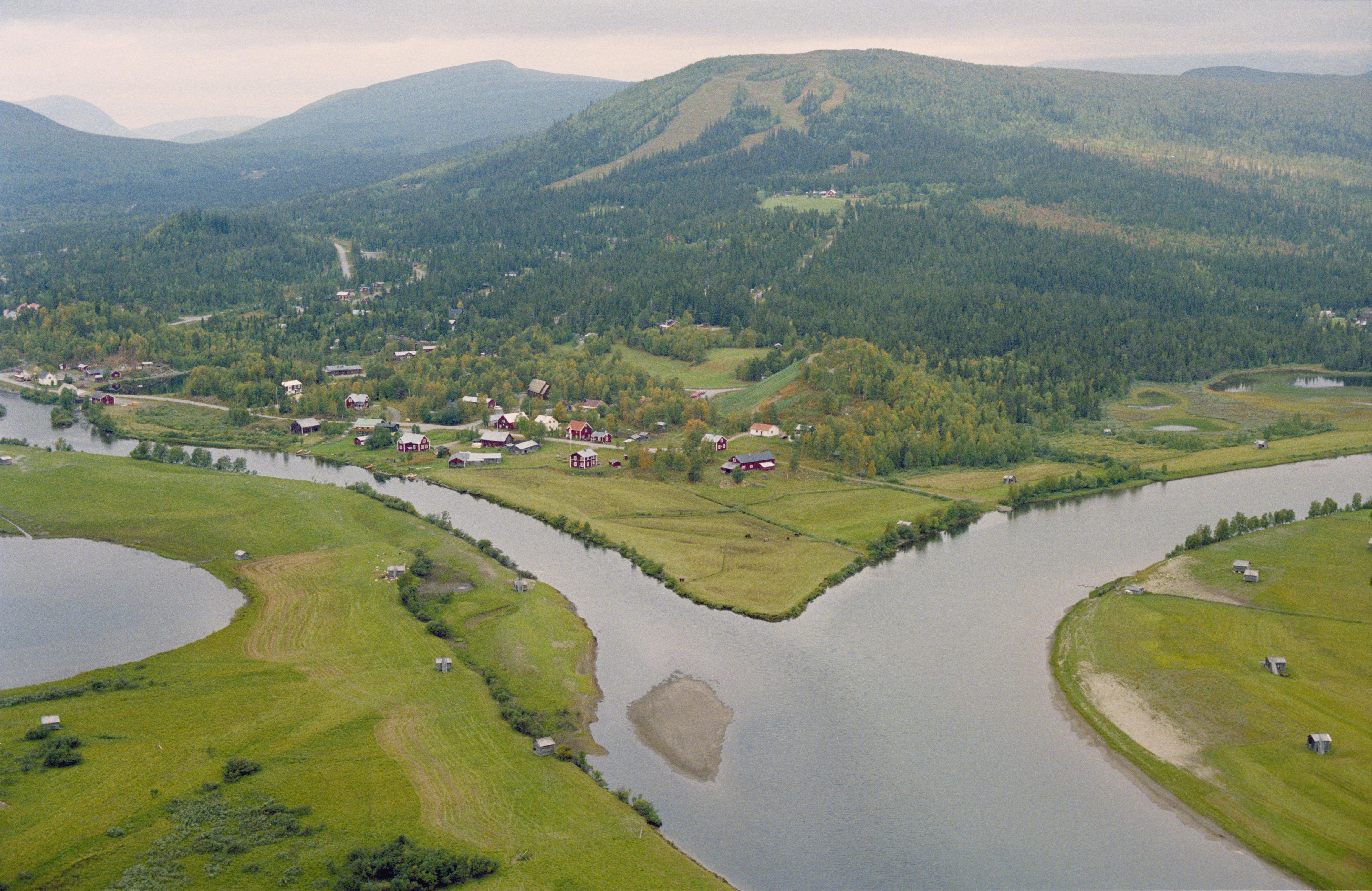 Beskrivning: Ammarnäs kyrkby (Gávtjávrrie) på Ammarnäset där Tjulån (till vänster) och Vindelälven (Vidduoljiennuo) möts i sjön Gautsträsket (Gávtjávrrie). Ammarnäs kyrka/kapel RAÄnr Sorsele 776:1 vid kullen Potatisbacken i bildens mitt. Bilden är tagen mot (väderstreck): V