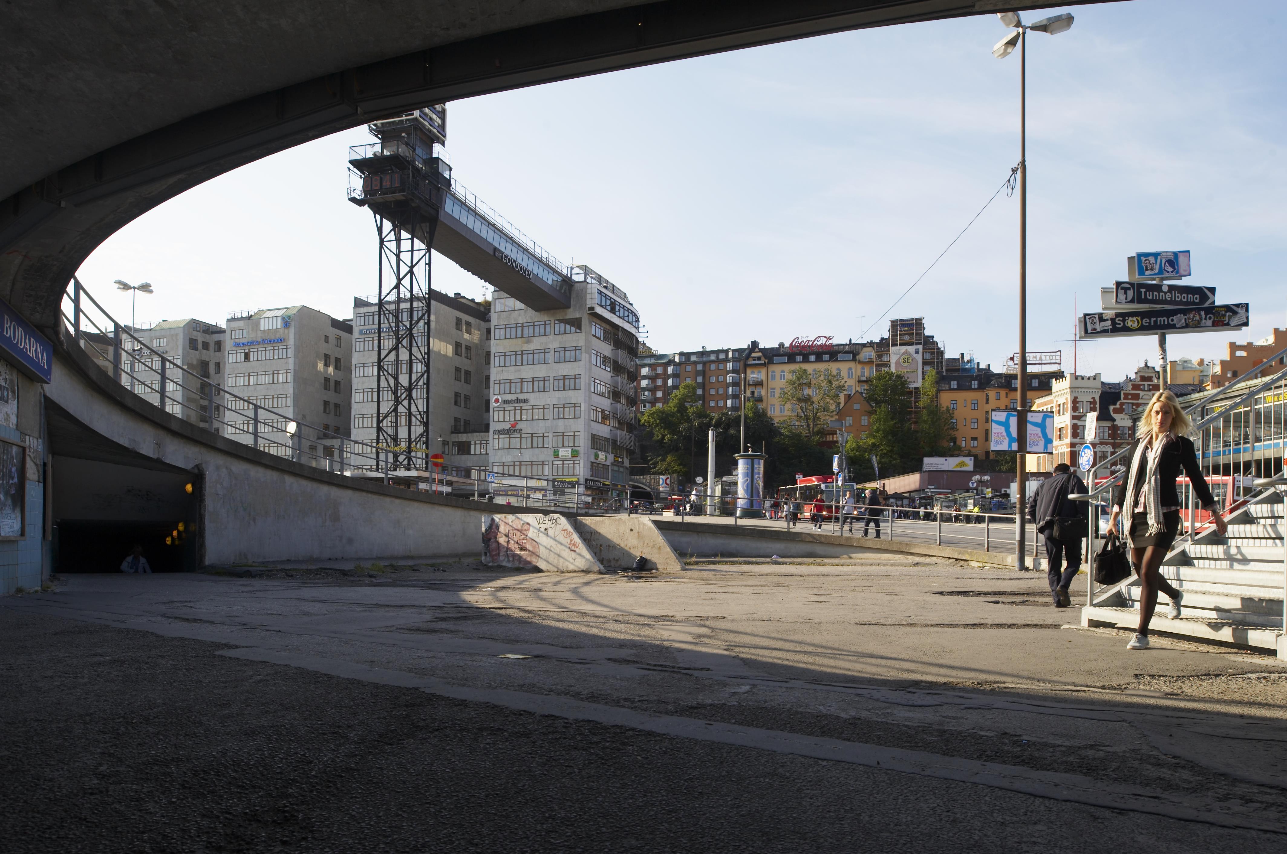 Beskrivning: Anmärkning (övrig): År 1930 tillsattes en kommitté för utredande av stadens kollektivtrafikfrågor, vilkens arbete resulterade i den anläggning som nu finns. Stadsplanekontorets ingenjör Gösta Lundborg och arkitekt Tage William-Olsson utarbetade förslaget till trafikanordningar med korsningar i tre plan i en "klöverbladsform". Trafiken fördelades i olika höjdnivåer, en för kajplanet, en för Munkbron - Katarinavägen och en för Skeppsbron - Södermalmstorg. Förslaget började genomföras 1931. Redan efter fyra år kunde trafikanläggningen invigas, den 15 oktober 1935. Samtidigt hade KF:s stora kontorshus och den nya Katarinahissen färdigställts. Beskrivning: Fotosyfte: Dokumentation