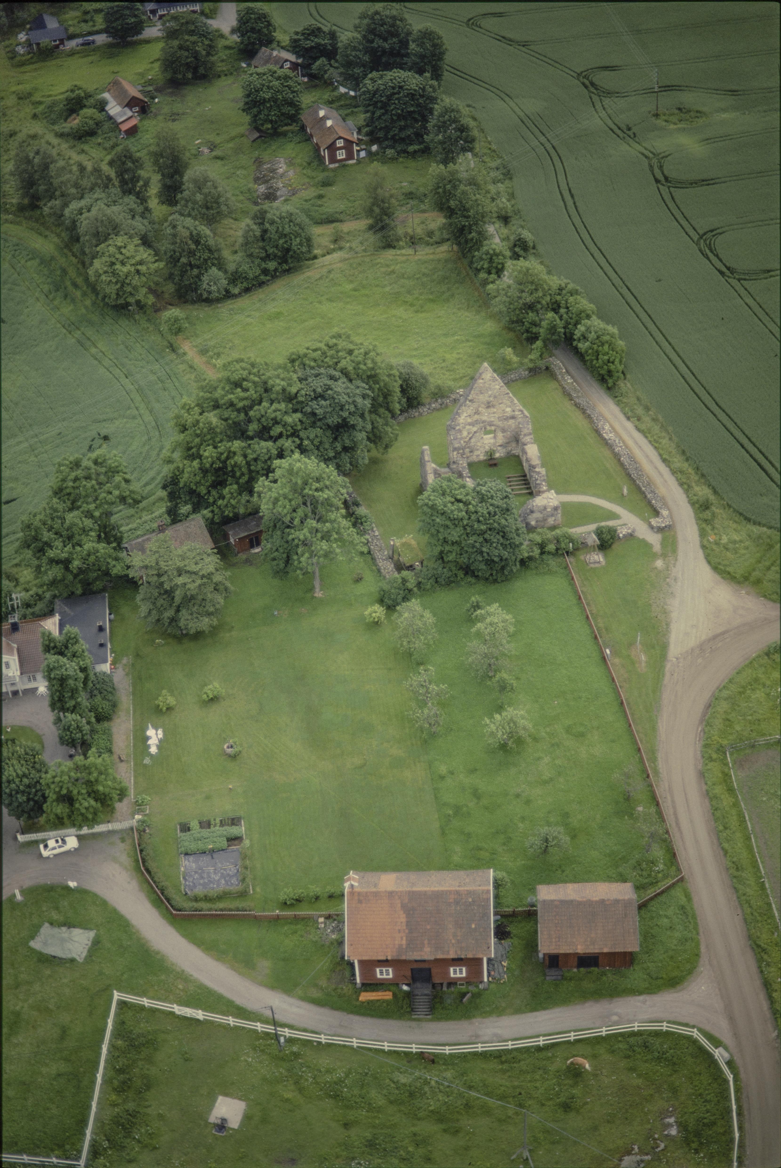 Beskrivning: Brottby kyrkby. Vid bildens mitt kyrkoruin RAÄnr Össeby-Garn 267:1 och gravfält Össeby-Garn 269:2 m.fl. Bilden är tagen mot (väderstreck): OSO