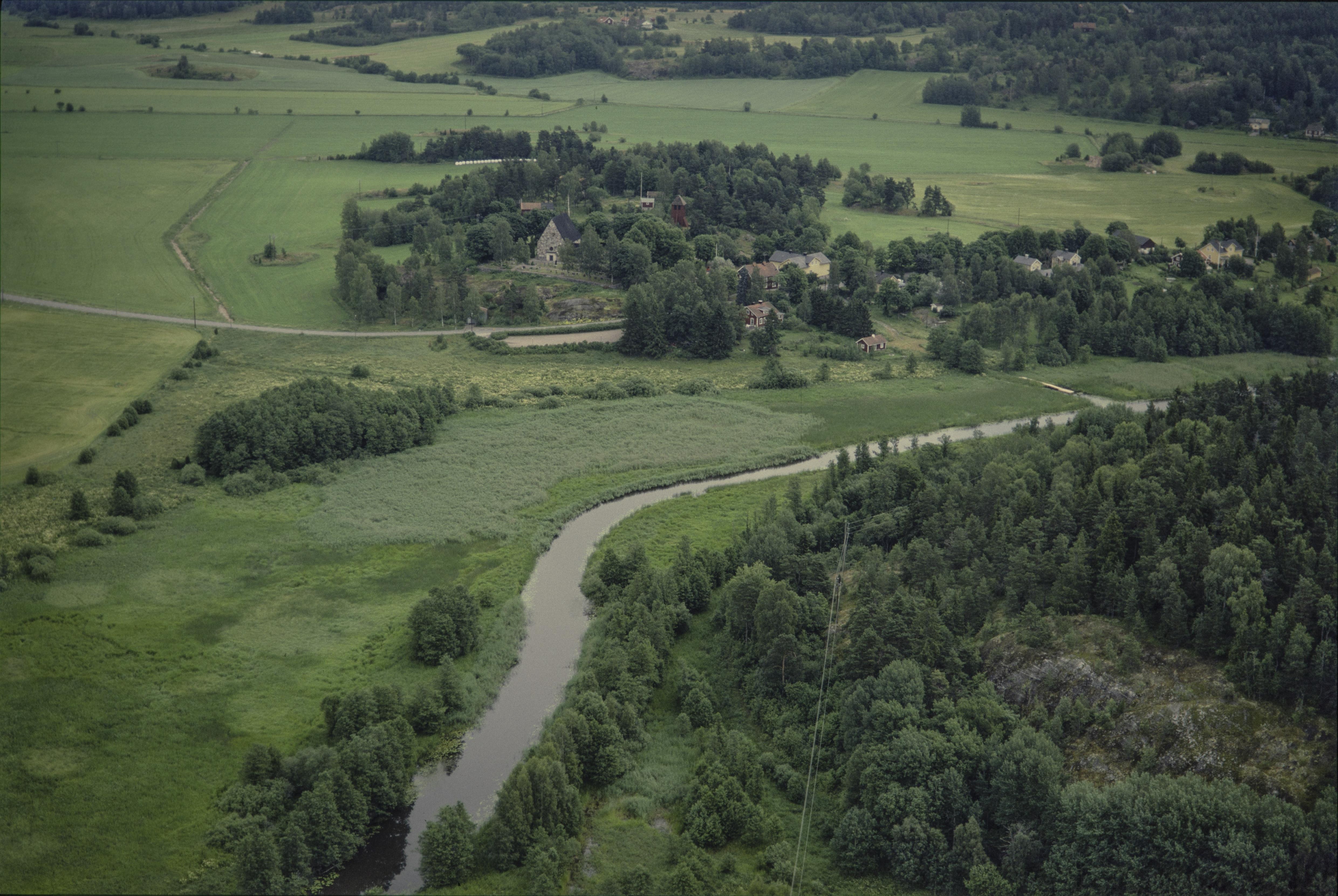 Beskrivning: Vid bildens mitt Össeby-Garns kyrka och kyrkby. Husaån i bildens nedre del. Bilden är tagen mot (väderstreck): NO