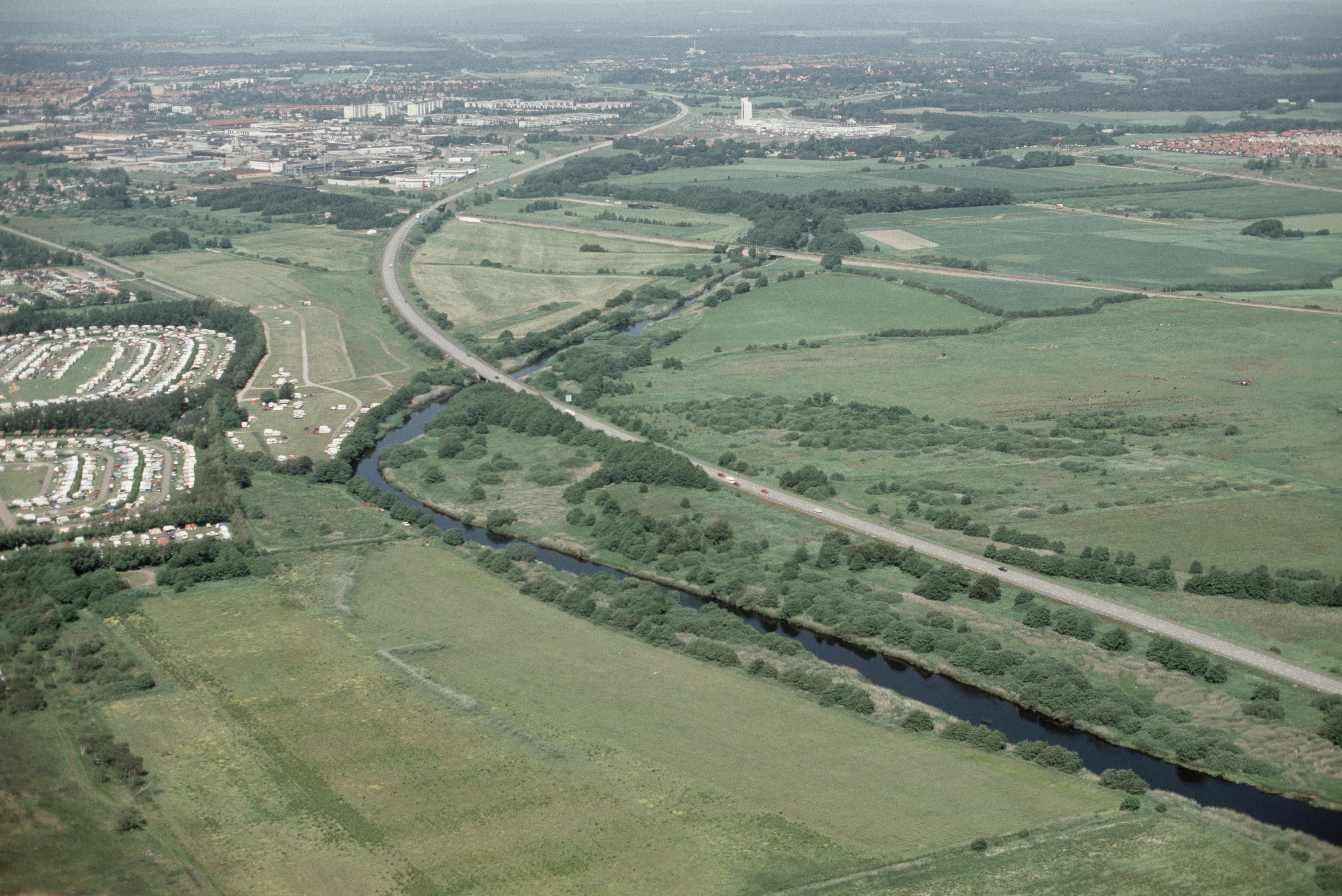 Beskrivning: Fylleån vid Hagön på gränsen mellan socken Halmstad (till v.), Trönninge (till h.) och Snöstorp (bildens övre del). Boplats RAÄnr Snöstorp 104:1 vid bildens mitt. Bilden är tagen mot (väderstreck): N