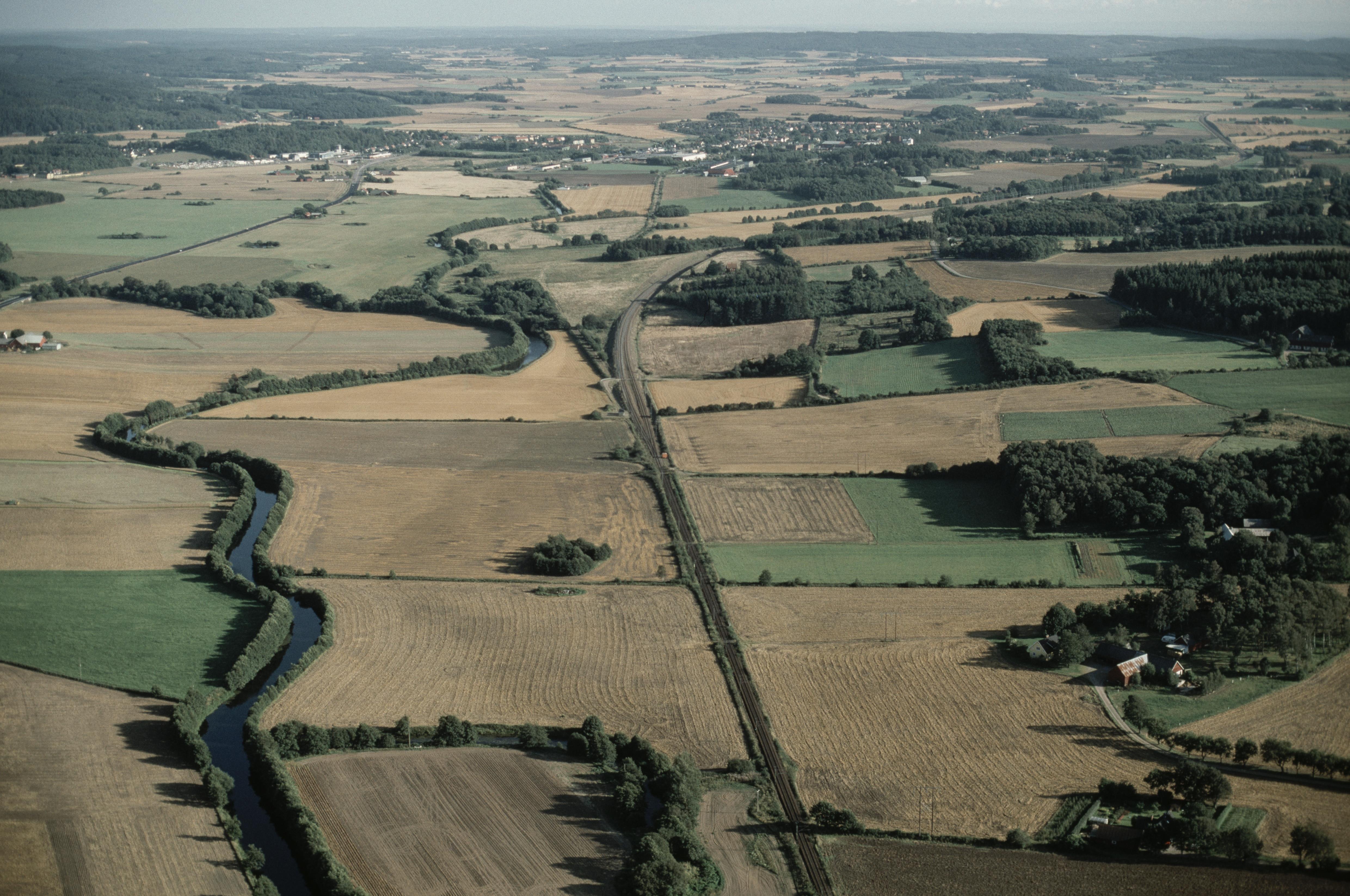 Beskrivning: Suseåns dalgång söder om tätorten och kyrkbyn Stenstorp, innan bygge av väg E6 mellan Laholm och Slöinge. Boplats RAÄnr Slöinge 109:1 vid bildens mitt. Getinge socken i bildens övre del. Bilden är tagen mot (väderstreck): SO