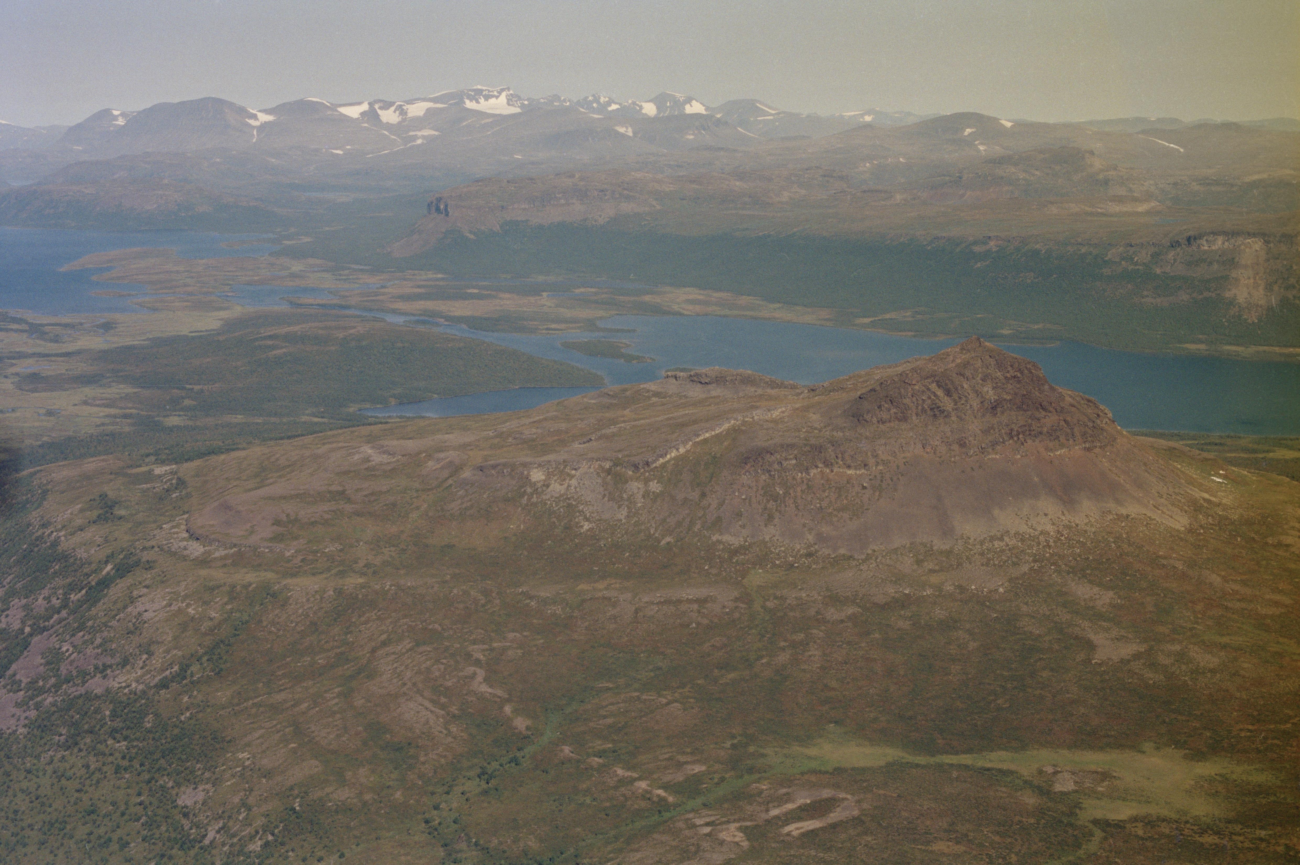 Beskrivning: Till höger fjället Akkavare (Áhkávárri) med offerplats RAÄnr Gällivare 60:1 i området vid sjön Läffasaiva (Laeffásáiva). I bildens övre del sjön Vuoleo Kaitumjaure (Vuolip Gáidumjávri). Sjaunja naturreservat. Bilden är tagen mot (väderstreck): N