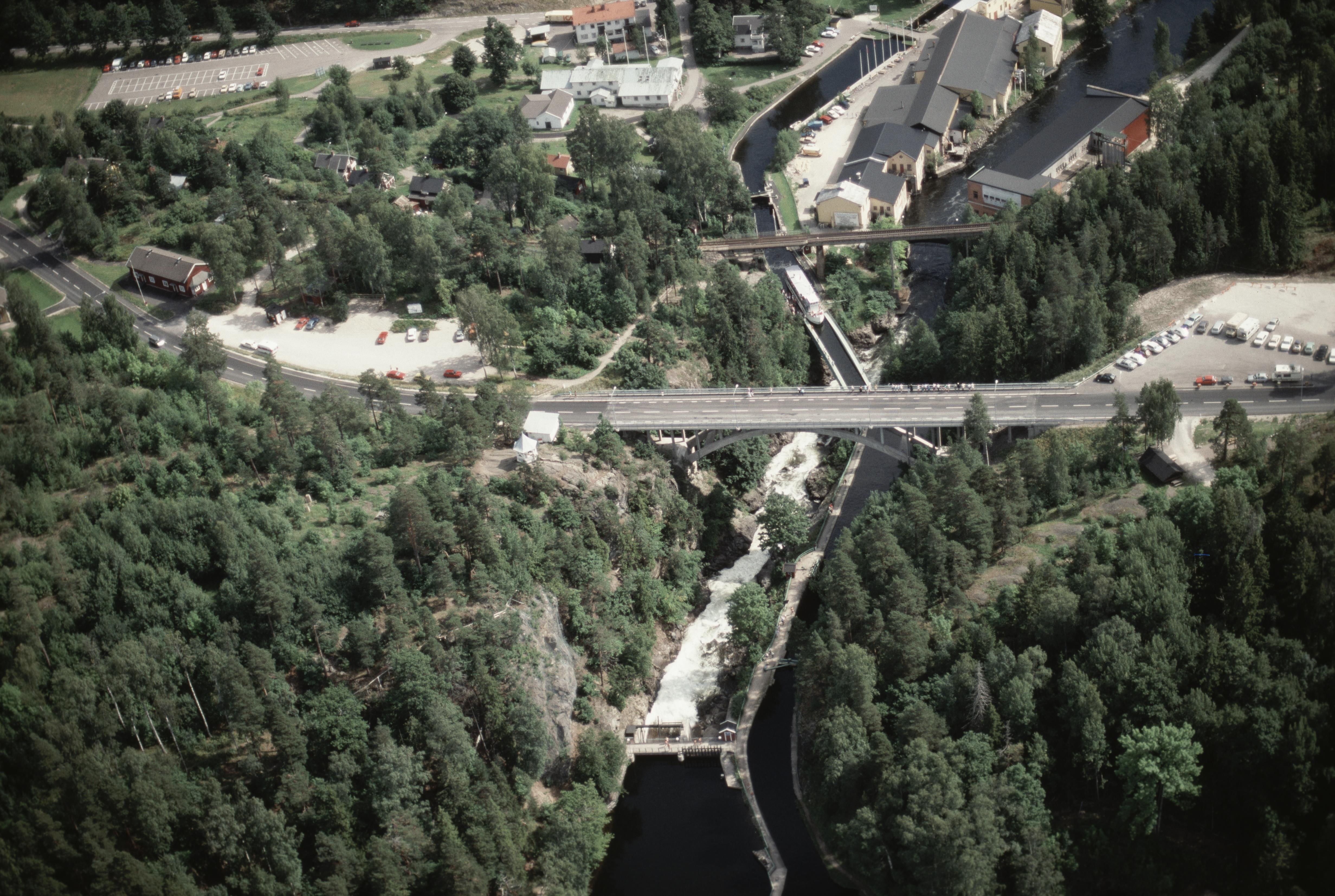 Beskrivning: Dalslands kanal vid byn Håverud, mellan sjöarna Åklång i väst och Övre Upperudshöljen i öst. Bro, järnvägsbro, akvedukt och sluss. Minnesmärke RAÄnr Skållerud 33:1-2. Bilden är tagen mot (väderstreck): Ö