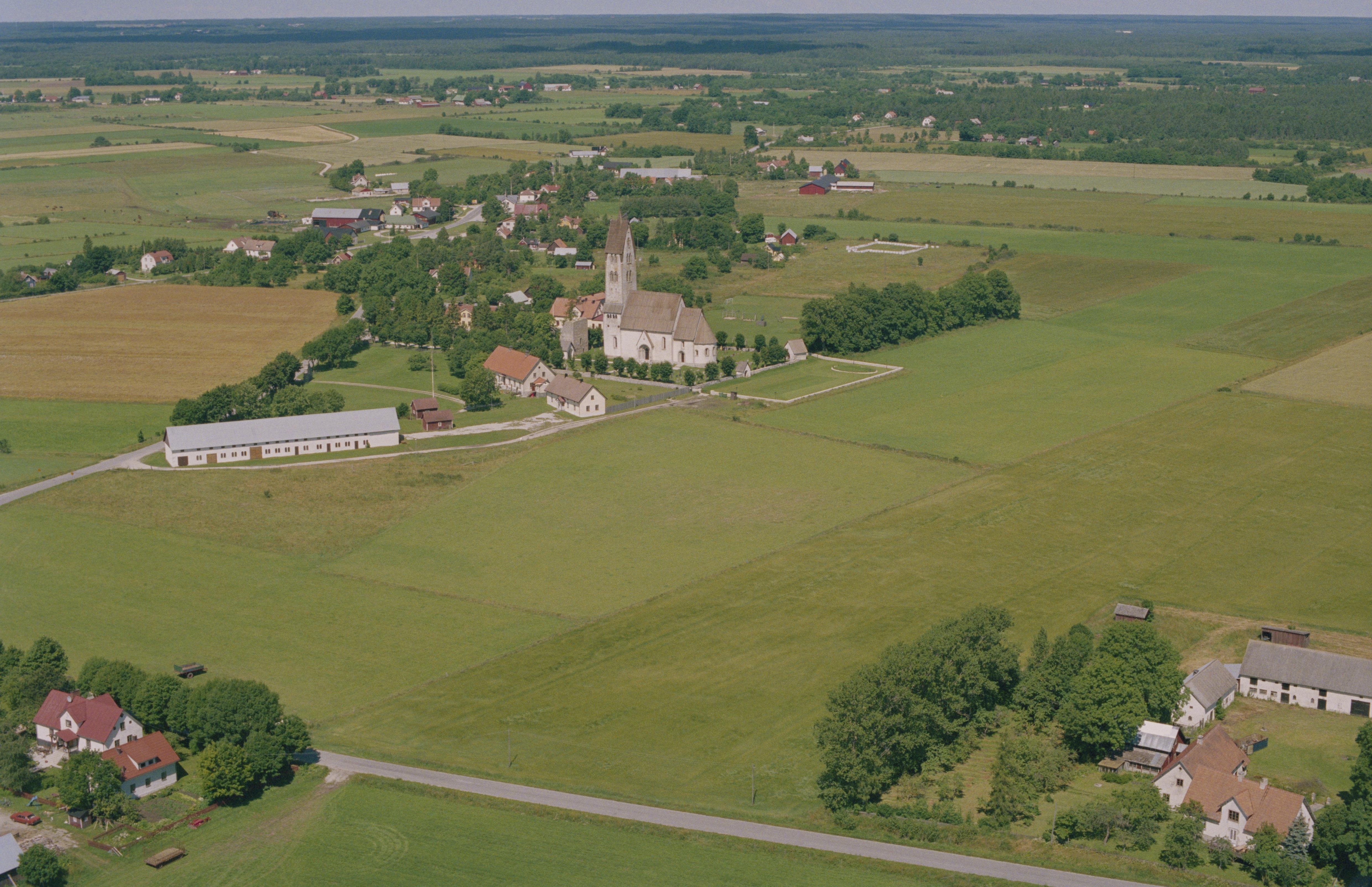 Beskrivning: Gothems kyrkby. Gothems kyrka över bildens mitt. Vid kyrkan flatmarksgrav RAÄnr Gothem 219:1. Bilden är tagen mot (väderstreck): NNV