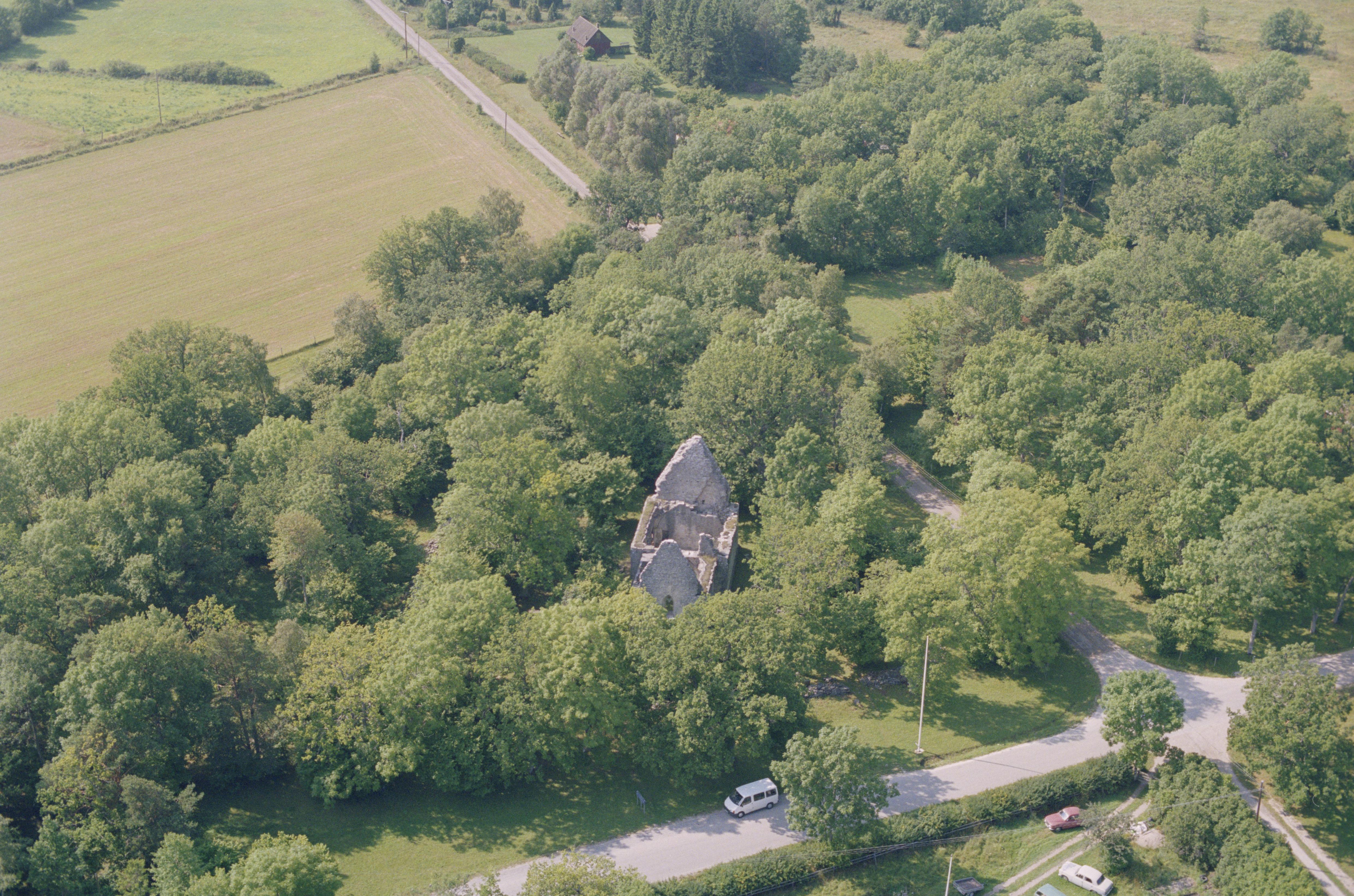 Beskrivning: Elinghems ödekyrka RAÄnr Hangvar 4:1 i fornborg Hangvar 4:2. Bilden är tagen mot (väderstreck): V