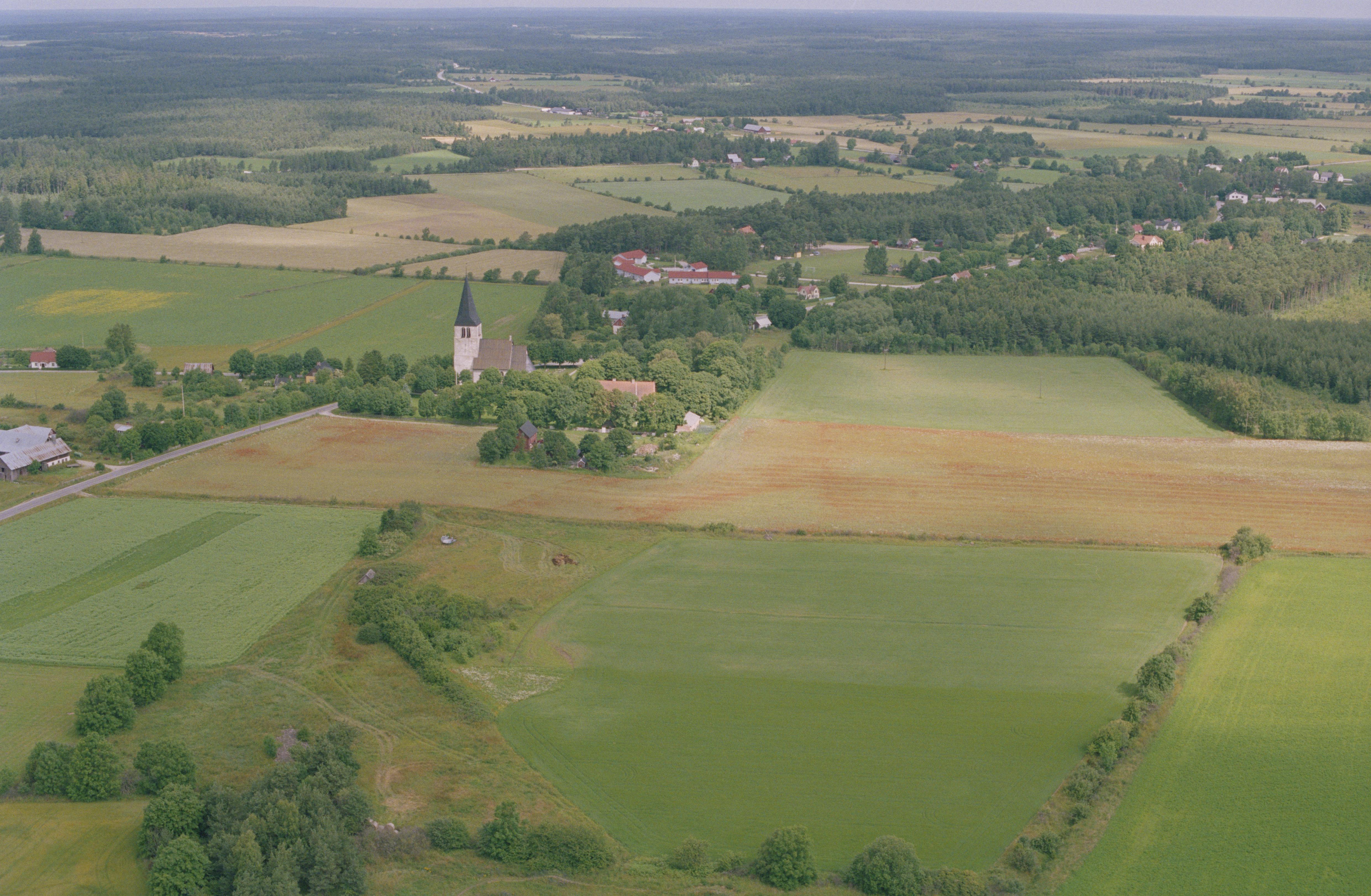 Beskrivning: Levide kyrkby. Levide kyrka till vänster om bildens mitt. I kyrkan runristningar RAÄnr Levide 73:1-2. Bilden är tagen mot (väderstreck): N