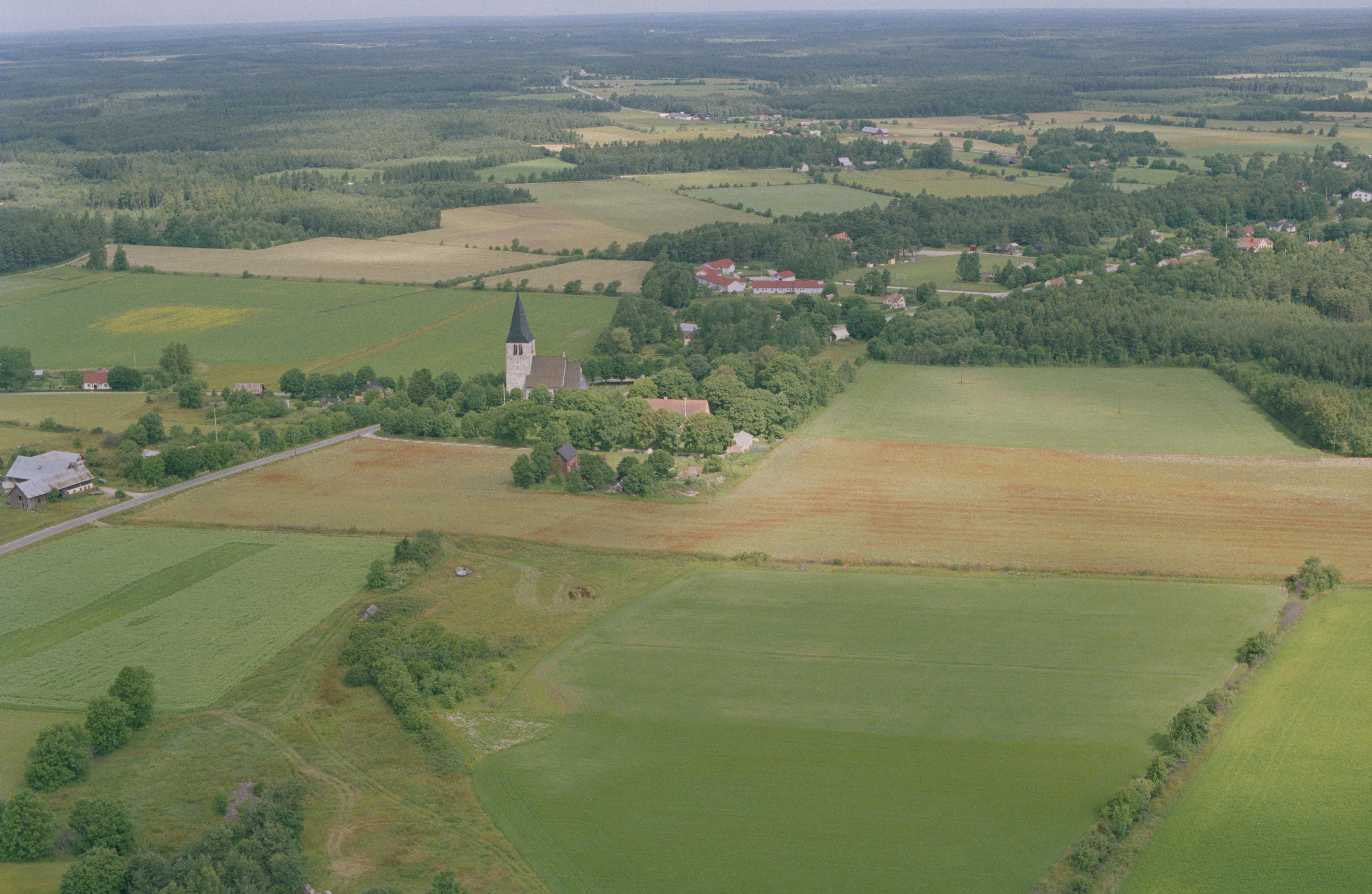 Beskrivning: Levide kyrkby. Levide kyrka vid bildens mitt. I kyrkan runristningar RAÄnr Levide 73:1-2. Bilden är tagen mot (väderstreck): N