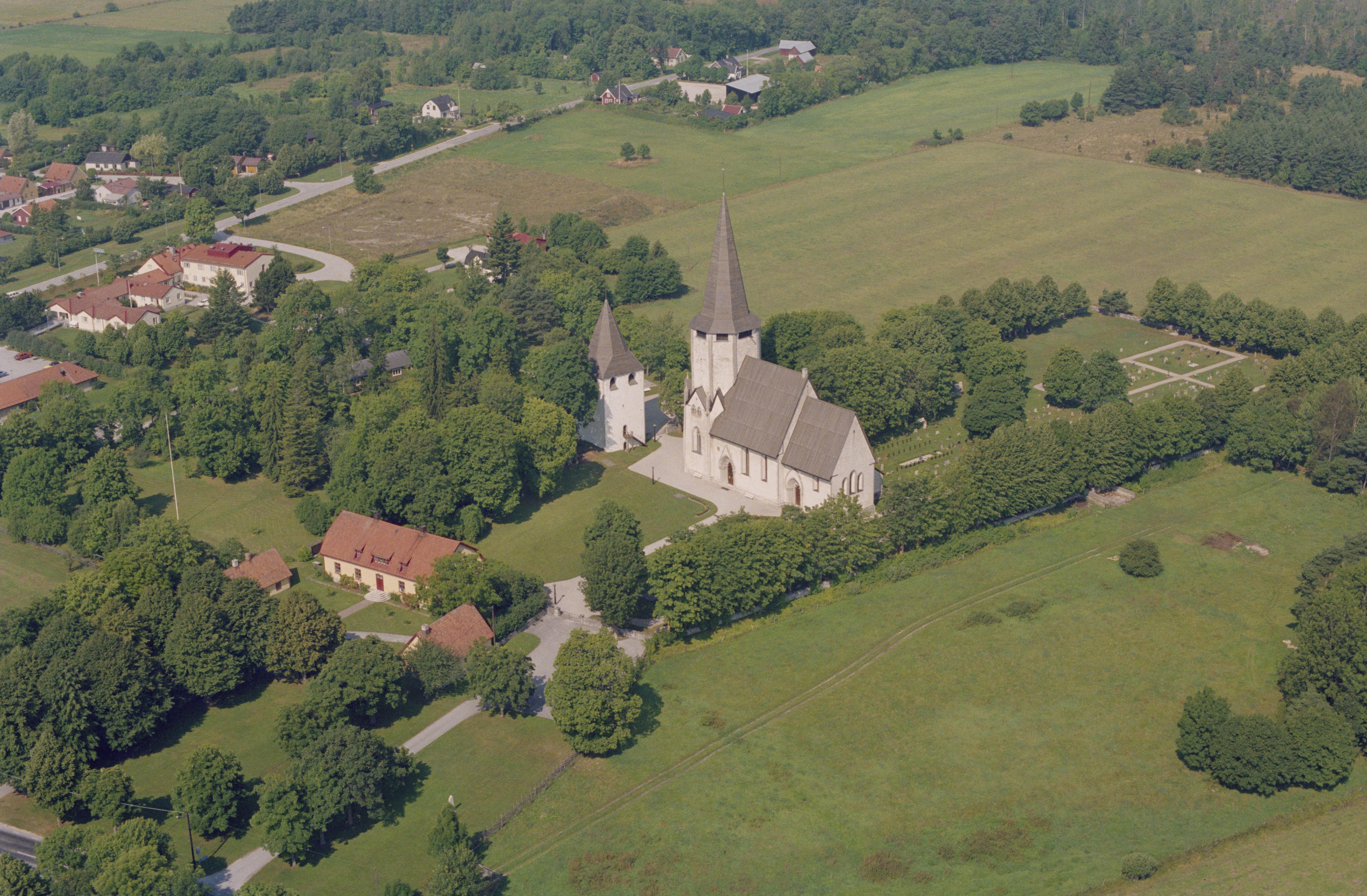 Beskrivning: Lärbro kyrkby. Lärbro kyrka i bildens mitt. Vid kyrkan stensättning RAÄnr Lärbro 179:1. Bilden är tagen mot (väderstreck): NV