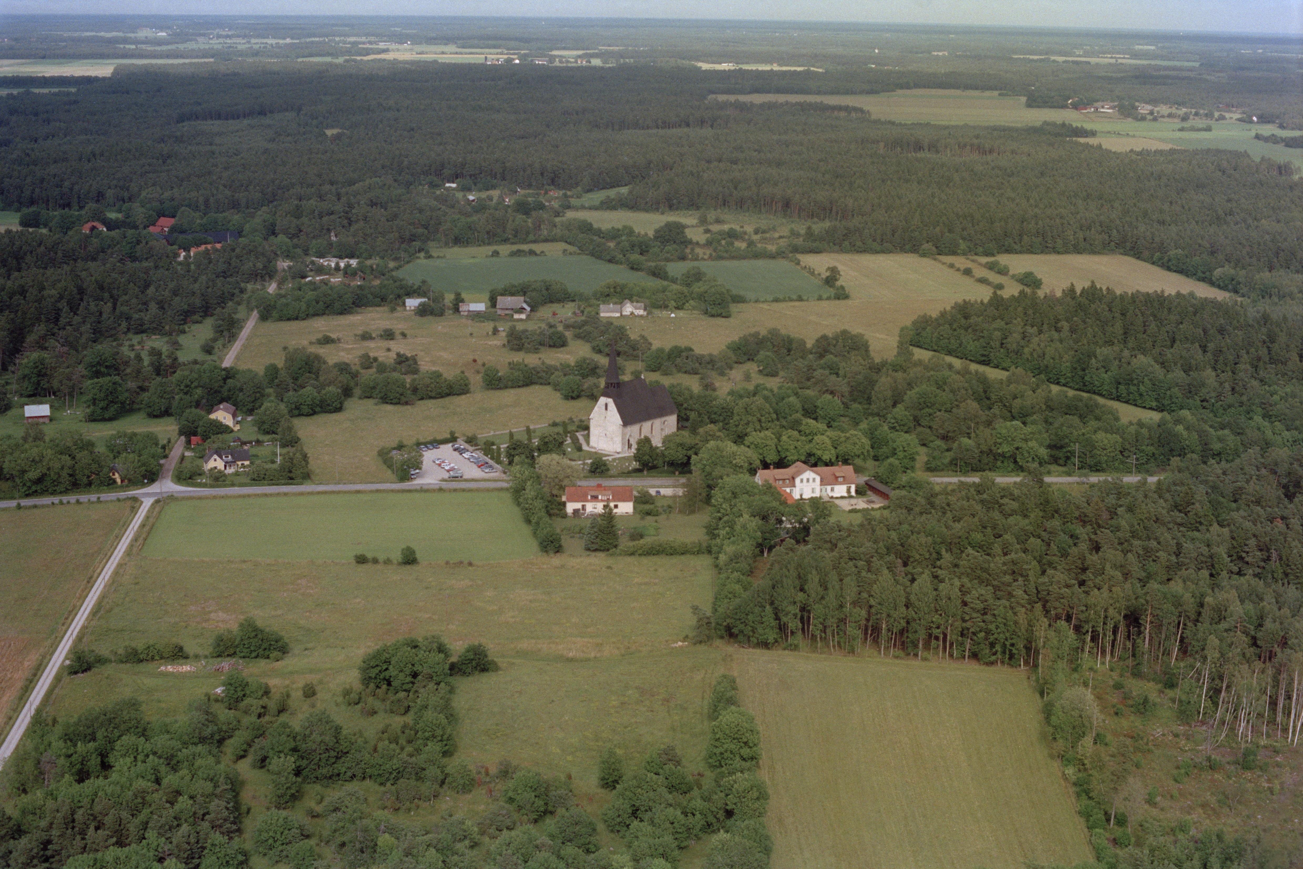Beskrivning: Väte kyrka och kyrkby. I bildens nedre kant fornborg RAÄnr Väte 89:1. Till höger om kyrkan bytomt RAÄnr Väte 90:1. Bilden är tagen mot (väderstreck): NO